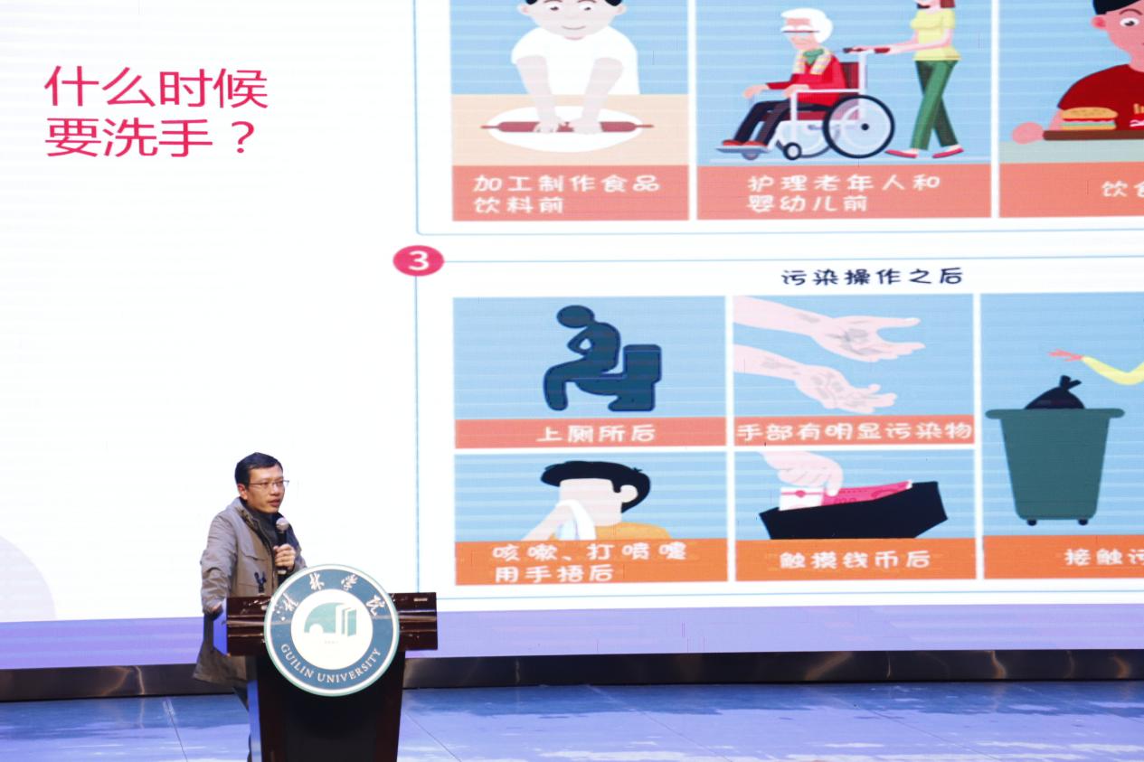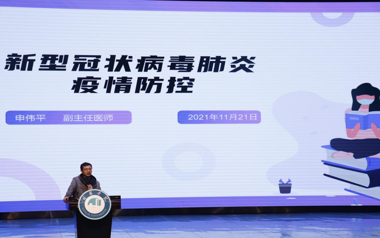 为了让同学们更好遵守国家和学校关于疫情防控的相关规定,让同学们掌握相应的防控知识和技能,养成良好的卫生习惯,做好自我防护。11月21日晚,特邀桂林市疾病预防控制中心免疫规划科副科长申伟平,在弘善讲堂开展“新型冠状病毒肺炎疫情防控”专题讲座,2021级全体同学参加本次讲座。
