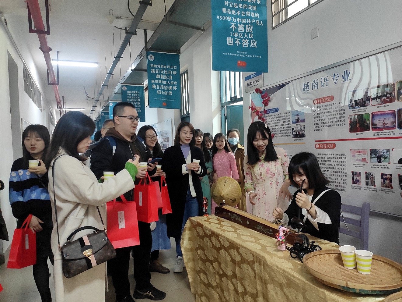 此次考察交流活动主要分为两个环节。首先,考察代表团参观了我院文化长廊,学习了解了我院近年来在书法、刻纸、茶艺等传统文化和东盟小语种,跨境商务等方面的办学成果。另外一个环节是交流座谈会,由大外第二教研室主任覃浩老师主持。座谈中,何玲院长对柳州工学院代表团的到来表示热烈的欢迎,并就近年来取得的办学成果、改革思路、师资队伍建设等方面向嘉宾们进行了介绍。接下来,学院相关专业老师依次向考察团介绍了我院近年来在区级一流课程建设、信息化教学改革、大学英语无纸化考试及在线课程建设、英语专业评估准备工作、应用型人才培养等教学改革及管理方面的情况。最后自由讨论环节中,双方院校老师也对各自相关专业及课程教学管理方面的工作进行了更深入的交流。