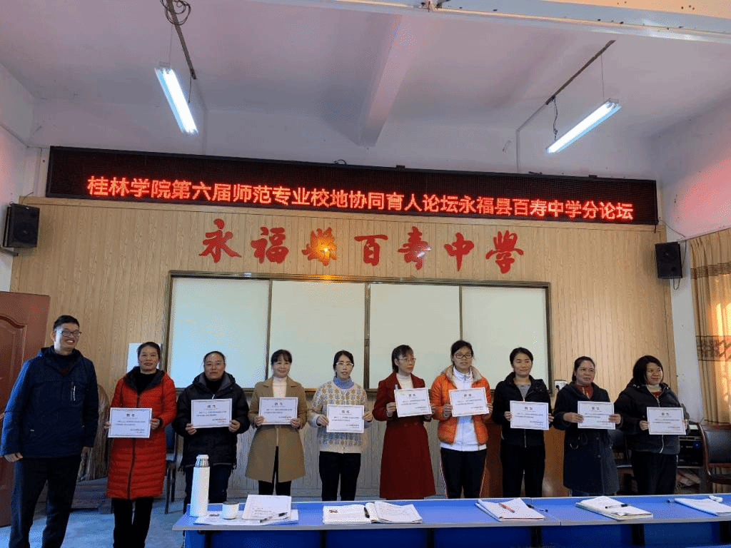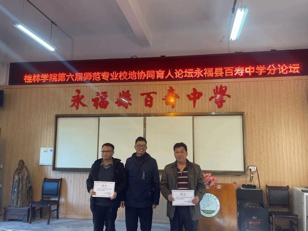 活动的最后,在永福县百寿中学江菊芬副校长的主持下,潘冠海教授为两位授课老师颁发荣誉证书,并对各位实习生的指导老师、班主任、黄富渊校长、何世光书记颁发聘书。同时,永福县百寿中学对桂林学院“协同育人”活动的开展给予高度支持,为表谢意,我院特为百寿中学颁发锦旗。