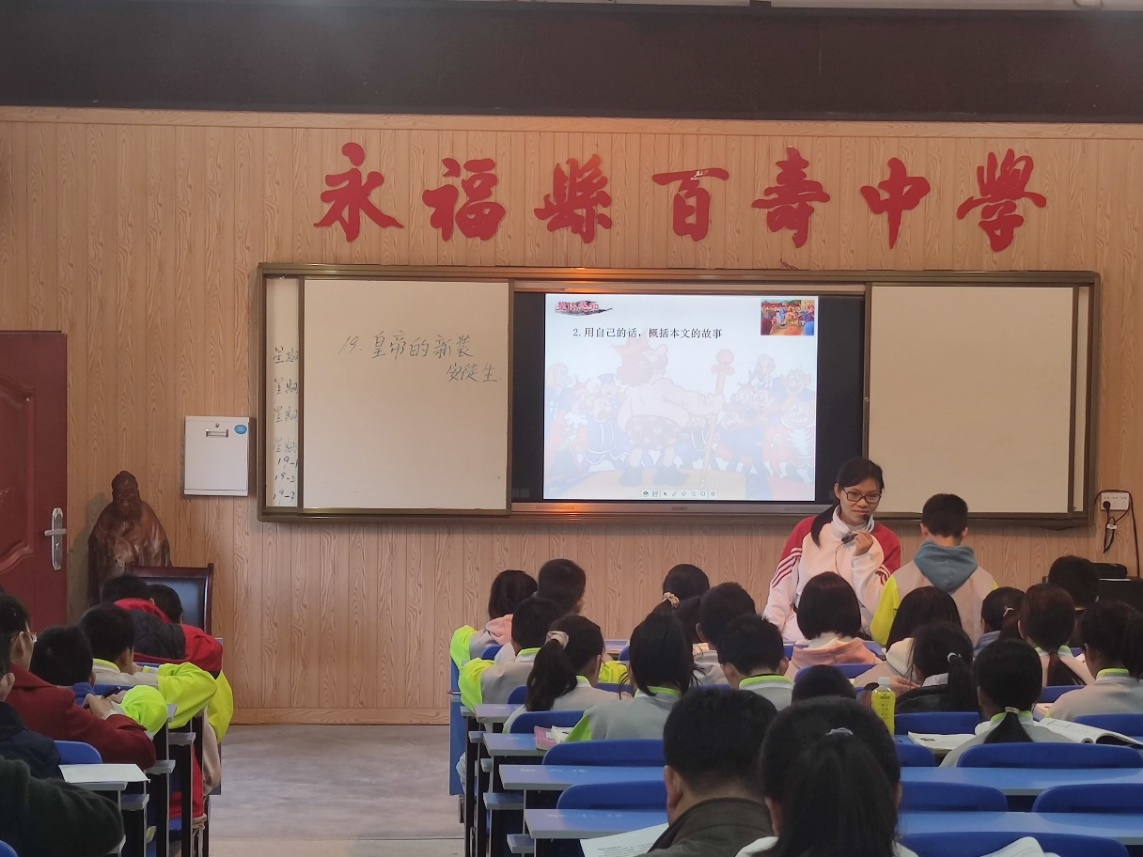 百寿中学李老师以优美的声音,将孩子们带入了新的课堂中,把“皇帝的新装就是一场骗局”为中心展开教学,通过简易图画来概括本篇文章脉络,其次根据人物形象特点分析进行重点解读,使整个课堂井井有条,生动有趣。最后点拨总结,揭示规律,真正让学生成为学习的主人。实习队的黄老师则运用自身活泼可爱的声音,使整堂课的气氛瞬间活跃起来,从“皇帝爱新装”、“骗子做新装”、“大臣看新装”、“皇帝穿新装”、“小孩揭新装”出发,次第厘清文章情节。学生无论是读生字词,还是整体感知的提问,都争先恐后地举起双手,积极地展现自己。黄老师以通俗易懂、生动的语言,切入人物形象特点进行文本分析,使长篇的童话故事变得简单懂起来,揭示了这场荒诞的闹剧,让同学们在快乐学习中明白了应无私无畏,学做真人。
