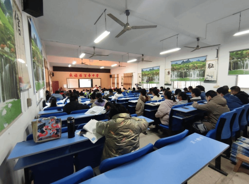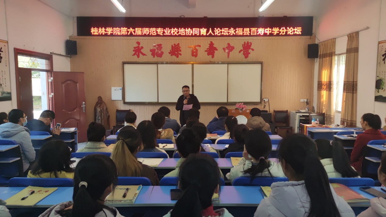 我院潘冠海教授、赵强副教授与邢政老师到场检验实习生实习成长实践成果,永福县百寿中学语文组全体老师参加活动,我院2018级汉语言文学百寿中学实习点全体实习生在现场听课学习。