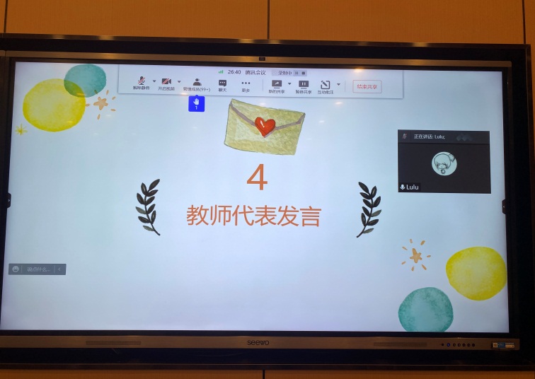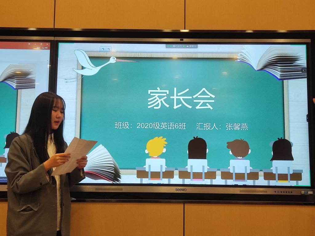 第一环节:辅导员讲解环节。介绍本年级专业的基本情况:2020级英语专业一共9个班(8个英语教育班,1个英语翻译班)共有240人。闭老师讲解了英语教育和翻译这两个方向的学分情况以及学校的管理制度,其中包括每周晚例会、学生宿舍检查、严格住宿管理制度、疫情防控制度和课堂考勤等多项制度,让家长们对学校管理制度有了更深的了解。第二环节:教师代表发言环节。荣幸邀请到语言文学学院副院长张超峰老师和语教师教育教研室主任陆海峡老师。张超峰老师谈到:“大学或许并不像我们想像的那样浪漫悠闲,当你处于大学之中,你会时而无助,时而疲惫,但这就是我们要吃的苦头”。这句话告诉我们家长以及孩子,大学并不是青年人享受的地方,而是一个让人成长的地方。陆老师也说到:“大学里,当你忙起来就不会有闲的时间,学会合理安排自己的时间去充实自己”。听完两位老师的发言,家长们和同学们都深有感触。同时,还邀请了两位家长代表发言。家长们的发言也让同学们知道:父母永远是孩子们坚强的后盾,孩子们只需要好好把握和珍惜现在。意在鼓励我们同学们勇往直前,与老师共同创造美好的校园生活!第三环节:各班展示环节。各班都为家长们精心准备了感恩视频展示,希望通过视频来跟家长们分享丰富的大学生活,更重要的是表达对父母的感恩之情。各班展示视频通过记录在校的住宿、饮食以及各种有趣的课堂课外活动,让远在一方的父母感到放心;也通过真情表白视频来表达对父母的爱与感恩,让深爱着同学们的父母感到骄傲与自豪。