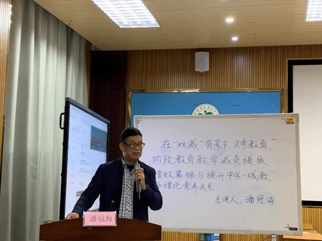 最后,由潘冠海教授做了评课。他首先对十四中对桂林学院对这次活动大力协作表示感谢,并对这次授课教师授予聘书。潘教授针对在“双减”背景下,就语文教育教学提质增效策略与提升中学一线教师理论素养关系,对在场的初中语文教师做了一场学术报告。潘教授的讲座,既有理论性,又有可操作性,同时结合自身的教育教学经历,分享了自己的教学经验,通俗易懂,形象生动。潘教授在讲话中指出:语文教学要根据语文课程的性质展开,根据语言文字的特点和人的思维规律开展教学,培养学生的思维能力,同时在教学中也要注重文体特点,根据文体特点进行教学。潘教授的讲座,十四中语文教师或益很多,李副校长给以很高的评价。