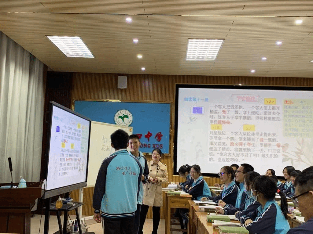 首先,在潘冠海教授的带领下,同学们观摩了《<西游记>名著阅读分享》和《水浒传》节选《智取生辰纲》的教学。在课堂上,两位老师的教学都让同学们受益匪浅。《西游记》的阅读分享课上,华黎江老师不仅利用信息化教学工具,还以小游戏的形式,让学生展开有关《西游记》的知识挑战赛,而且在西游经典“我来展”的环节中,还让学生们通过绘画、书法、手抄报、PPT等形式分享自己阅读《西游记》的感悟,同时以课本剧表演的形式,再现西游的经典情节,教学方式独具匠心,让学生在学习语文知识的同时又展现了才艺,课堂氛围异常活跃。