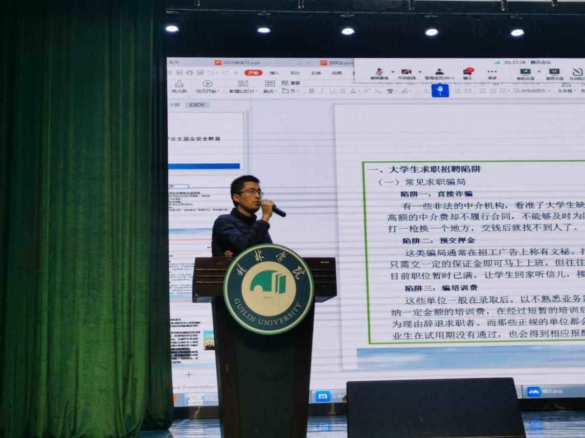 毕业生辅导员王亮老师为毕业生作就业安全教育知识讲解,对毕业生们在求职中会遇到的招聘陷阱进行了细致讲解,在积极就业的同时更要提高警惕,提高防诈骗意识。