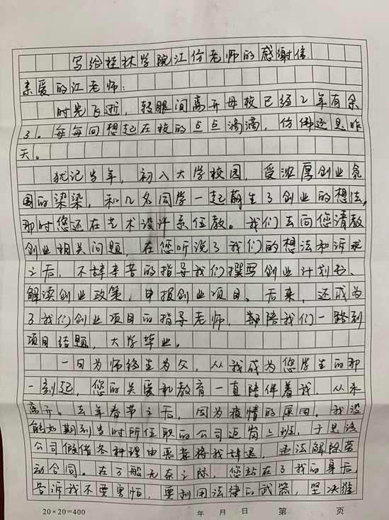 图为:学生严仕林写给江防书记的感谢信(1)