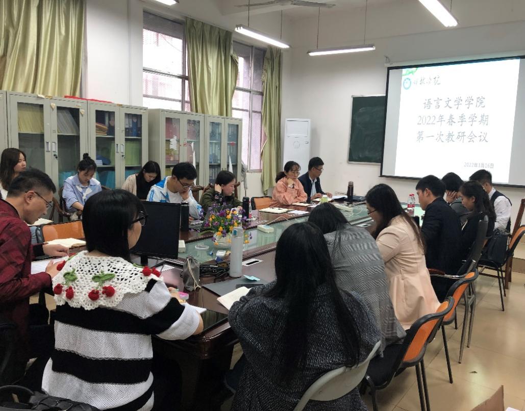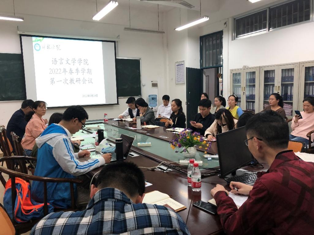 为全面提高学院科研竞争力,总结学院教学科研工作成果,探讨部署学院新学期的教研工作主题和方向,语言文学学院于3月16日下午在2108会议室召开2022年春季学期第一次教研会议。会议由学院副院长张超锋主持,学院领导班子成员、各教研室主任、思想政治辅导员和教学秘书参会。会议围绕新学期各教研室工作计划、学生工作安排及管理、学院教学工作部署方向、各专业评估及专业建设计划四部分进行。
