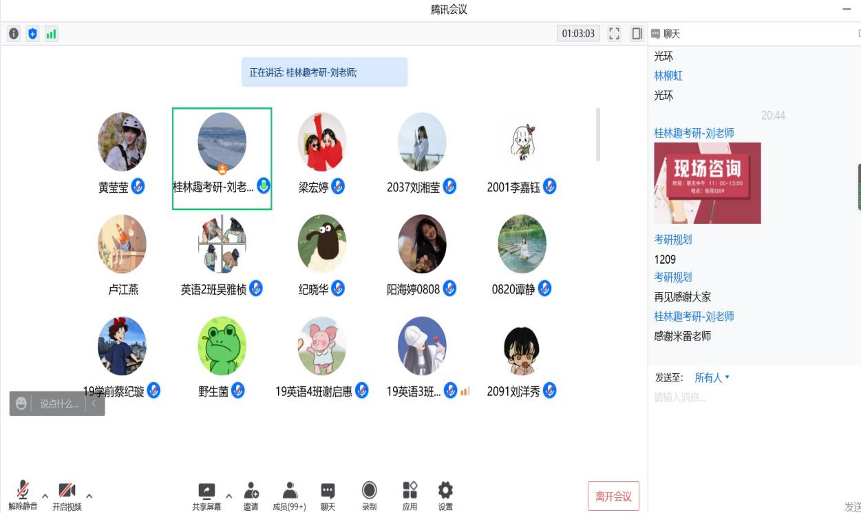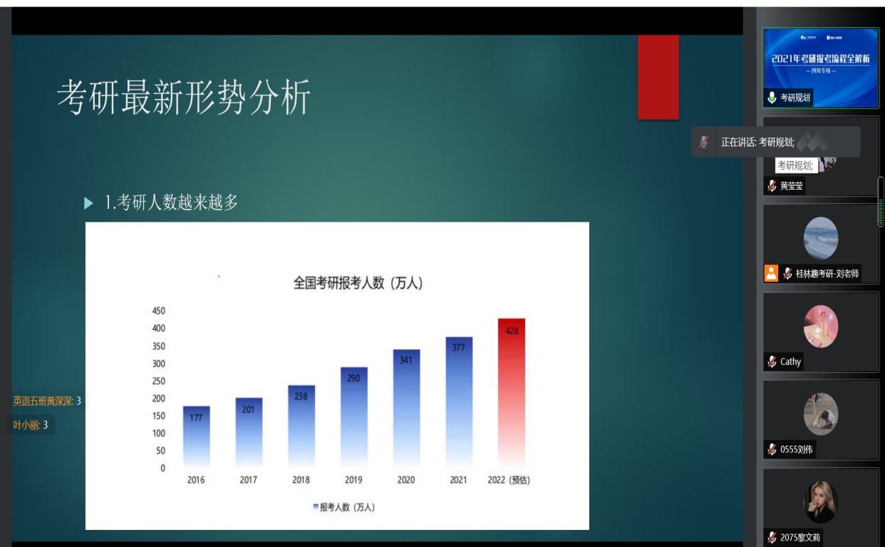 为了加深学生对考研的了解,树立明确考研目标,掌握相关考研技巧和增强同学们的考研斗志。3月20日晚,语言文学学院在线上举行了“2023考研全程规划暨2022国家线解析”,特邀资深考研咨询师米雷老师分享考研全程规划及备考攻略,有意向参加考研的同学参加本次讲座。