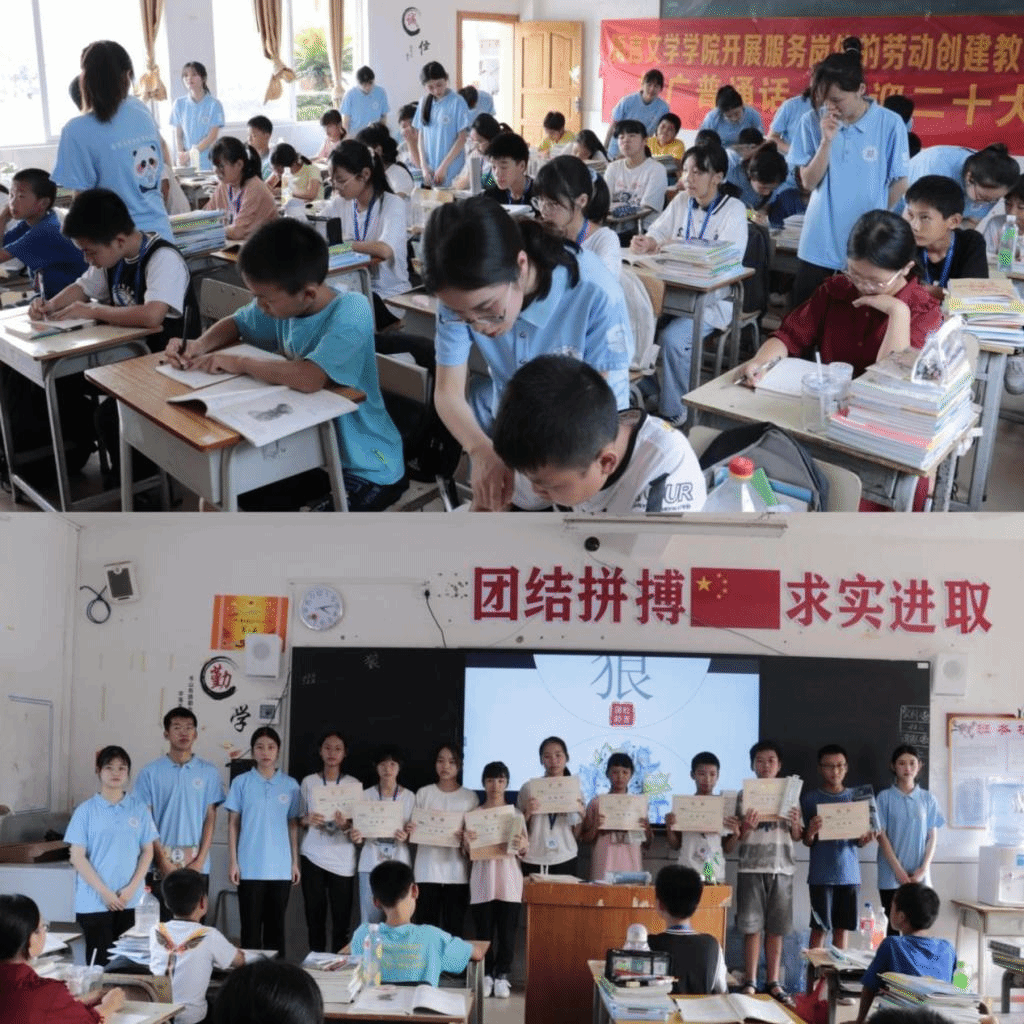 大学生步入初中课堂,与所在班级学生进行实践教学,我院学生代表阳霖辅和张锦延同学分别担任该校初一年级四班和五班的助教老师。在教学互动环节中,两位主讲人提问学生,学生们积极举手回答问题,产生了浓厚的学习氛围。在汉字和英文书写教学环节中,对所在班级学生进行书写教导,矫正学生写字的不良习惯,帮助他们理解书写的正确方式。最后在评比“优秀书写者”环节结束课堂教学活动,对所带班级学生的课堂书写表现评选出前二十名优秀同学,给他们颁发证书和奖品。