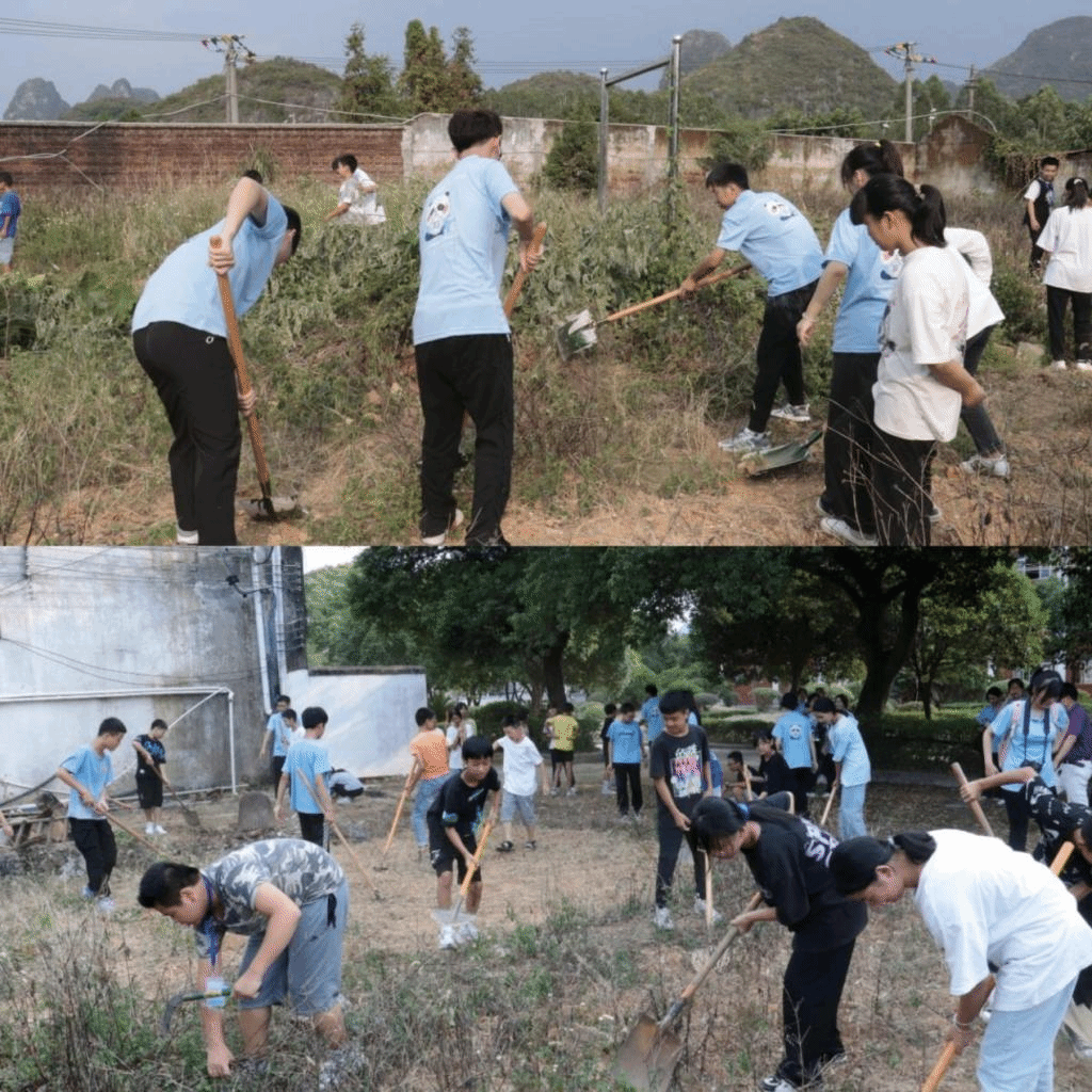 学院学生代表与罗锦中学同学们一起进行除草劳动