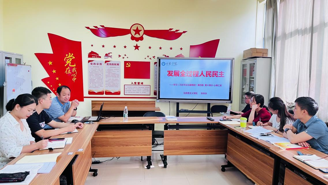 会议第一阶段由马克思主义学院院长张常永领学《习近平谈治国理政》第四卷中关于《发展全过程人民民主》。习近平总书记指出,民主不是装饰品,不是用来做摆设的,而是用来解决人民要解决的问题的。全过程人民民主,既有鲜明的中国特色,也体现了全人类的共同价值,为人类民主事业发展探索了新的路径,为丰富和发展人类政治文明奉献了中国智慧和中国方案。全过程人民民主不是束之高阁的民主宣言,而是具体的民主实践。它既有时间上的连续性,内容上的整体性,运行上的协同性,也涵盖了人民参与上的广泛性和持续性。全过程人民民主巩固和发展了生动活泼、安定团结的政治局面,激发和凝聚了人民群众奋斗新时代、奋进新征程的磅礴力量,为人类政治文明进步作出了充满中国智慧的贡献。
