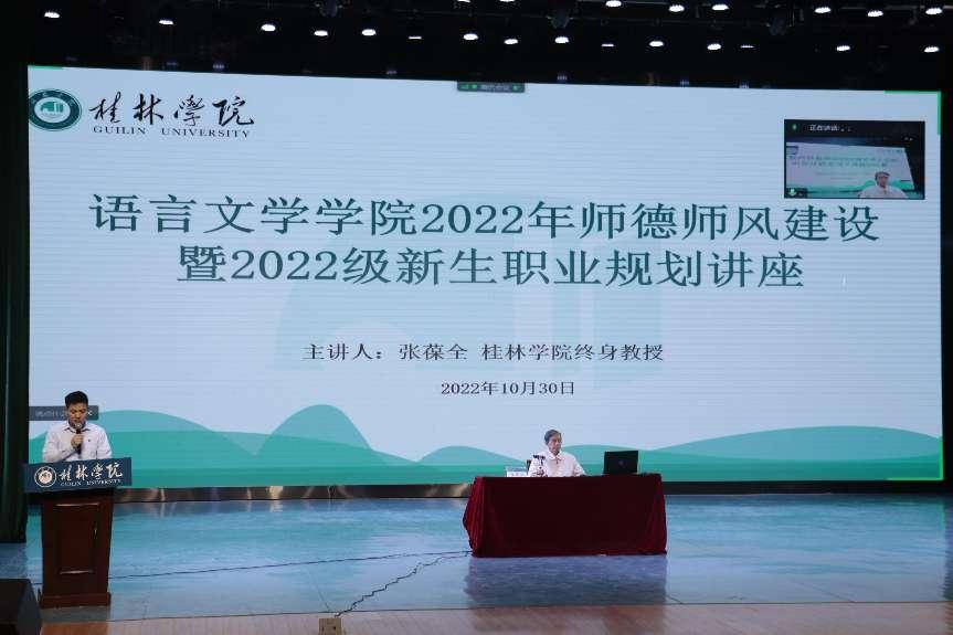 为深入学习贯彻党的二十大报告精神,办好人民满意的教育,全面贯彻党的教育方针,落实立德树人根本任务,进一步推进我院师德师风建设,10月30日上午语言学院学院邀请学校终身教授张葆全教授为学院师生做讲座,此次讲座主题为“语言文学学院2022年师德师风建设暨2022级新生职业规划讲座”,活动采用“线上+线下”相结合的形式开展,学院教师和高年级学生在线上参加活动,2022级新生在现场参加活动。