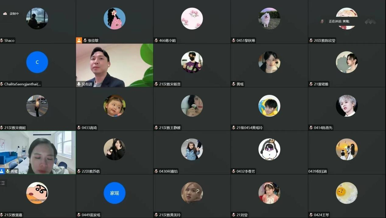 为帮助汉语国际教育专业学生拓展国际中文教学视野,12月8日晚,“泰国大学生汉字学习情况及教学”主题的学术沙龙讲座(第十一期)在线上召开。本次讲座由泰国格乐大学中国国际语言文化学院汉语国际教育专业吴有进博士担任主讲,汉语国际教育教研室黄鹭老师主持,泰国格乐大学莫雅智老师、桂林学院合作发展处邓慧玲、汉语国际教育教研室张佳敏老师出席讲座,2020级、2021级和2022级汉语国际教育专业学生参加本次讲座。、