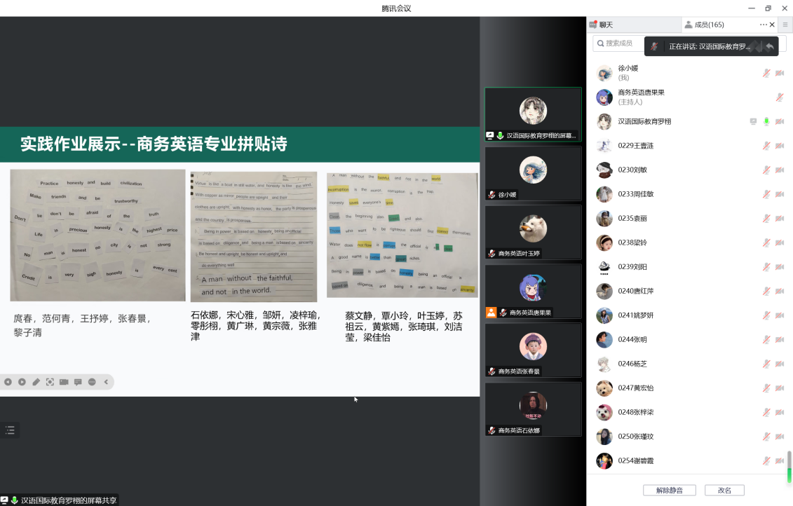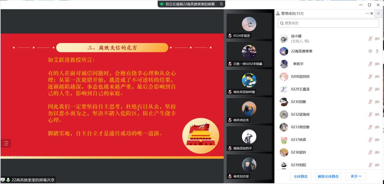 高校既肩负着为党育人、为国育才的光荣使命,也是推进廉洁建设的重要阵地。按照我院入学教育工作安排,并结合学院实际,2022年12月,我院集中开展以“弘扬清风正气,激励担当作为”为主题的廉洁教育活动。活动期间,我院2022级各专业,分别结合专业特色,在专业辅导员的引导下,以线上班会的形式,通过书法展示、英文拼贴诗、廉洁视频观看、廉洁故事分享等内容感悟廉洁文化。