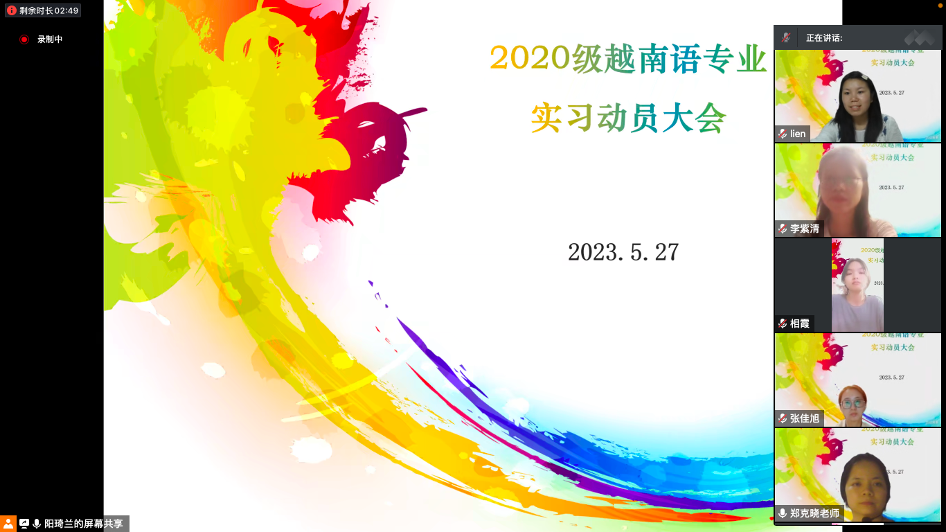 为了扎实做好2020级越南语毕业生实习工作,进一步促进学生对所学知识和技能的实践运用、总结和深化,引导学生认识实习的目的和意义。5月27日晚上,人文学院越南语专业2020级本科实习动员大会在腾讯会议上召开。越南语专业老师阳琦兰、郑克晓,梁姗姗以及2020级越南语专业全体学生参加了此次会议。会议由阳琦兰老师主持。