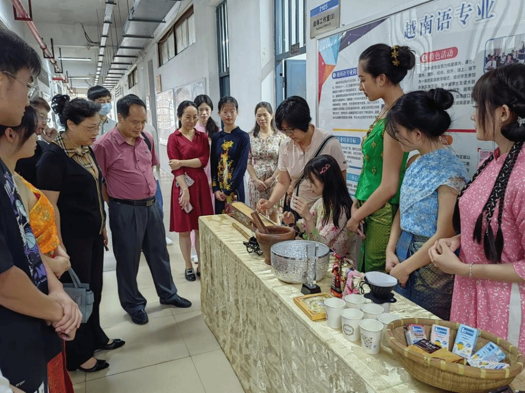 泰语、越南语专业的学生还向到访的领导展示了泰国木瓜沙拉、越南咖啡等特色美食的制作技巧,以及泰国传统礼仪和服饰文化、越南奥黛文化和独弦琴演奏等才艺。谢漓主任一行对学生们制作的泰国、越南的特色美食和饮品赞不绝口,并询问了学生们上述美食的制作方法和相关的文化背景知识,在场的学生凭借自身扎实的专业文化基础一一进行解答。谢漓主任还亲自参与了越南独弦琴演奏,与学生们一起体验了这种乐器的独特魅力。谢主任一行对我院越、泰语专业的学生们的才艺表演大加赞赏,也对泰语、越南语专业既注重夯实专业语言能力,又能让学生在中国优秀传统文化和语言对象国优秀传统文化的浸润中全面发展、健康发展的教学理念深表认同,同时还鼓励学生继续努力,学好专业,将来为地方经济和社会发展作出更多的贡献。