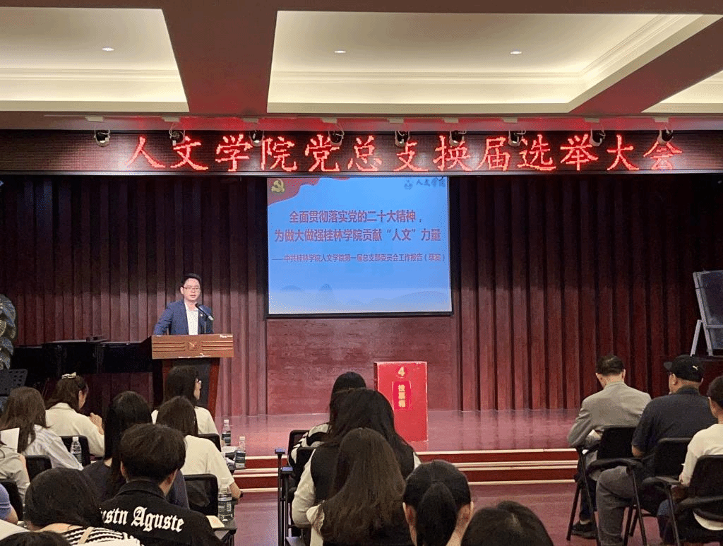 随后,人文学院党总支书记、副院长庞一飞代表学院上一届党总支作工作报告。报告以《全面贯彻落实党的二十大精神,为做大做强桂林学院贡献“人文”力量》为题,对上一届党总支工作进行了全面的回顾,总结了取得了成绩,也指出了存在的不足。报告紧紧围绕学校第一次党代会确定的中心任务,以实现做大做强桂林学院为目标,结合学院实际,提出了今后工作的主要任务和思路:一是坚持立德树人,大力培养“至善”莘莘学子;二是强化师德师风建设,培育高质量“至善”师资队伍;三是深化“至善”教学改革,做强学院学科专业建设;四是推进“至善”依法治院,共建清廉和谐平安人文;五是落实全面从严治党,夯实“345”党建工作机制。