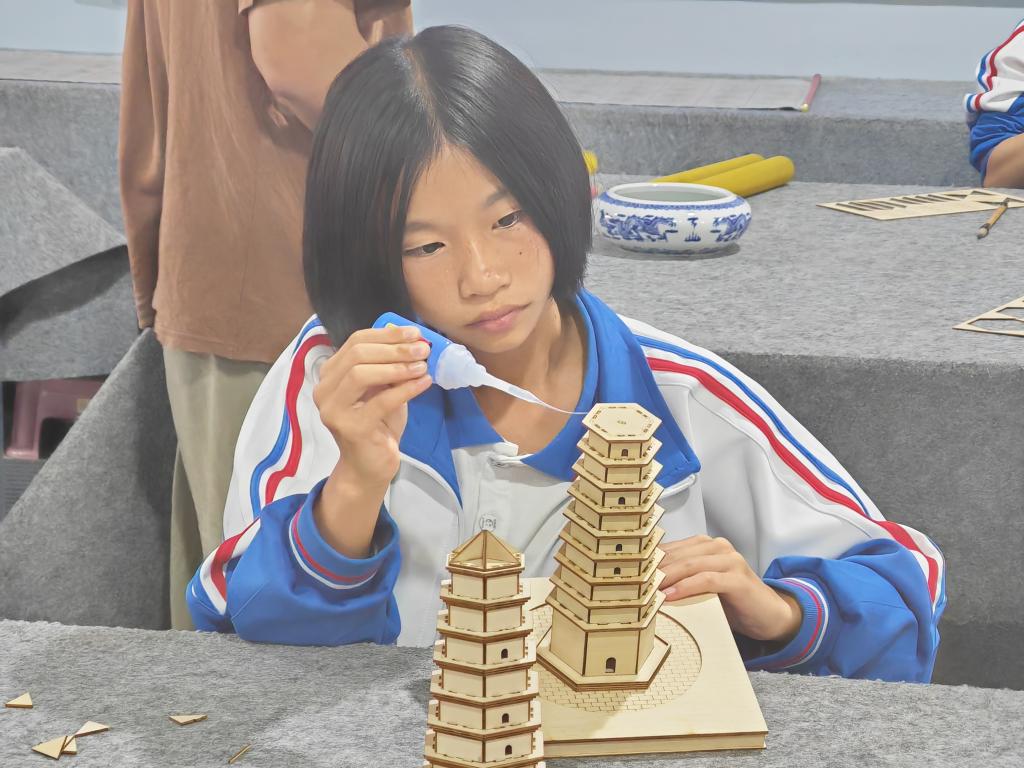 校团委以及城市设计学院“木构学生艺术实践工作坊”的师生则指导永福县实验中学的学生开展了“模型艺术赋能美丽乡村”手工制作活动。他们向学生介绍了桂林的代表性建筑,如日月双塔、象鼻山等,并以此为实践模型,带领学生进行手工组装。