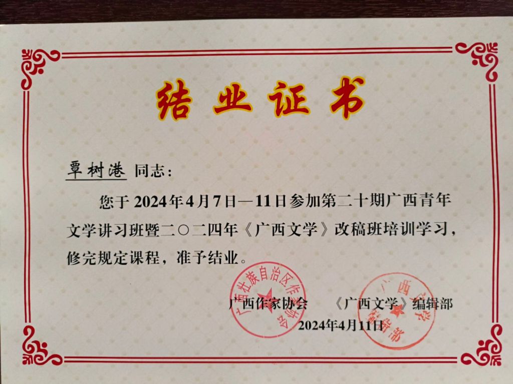 近日,第二十期广西青年文学讲习班暨二〇二四年《广西文学》改稿班在广西大学举办。人文学院2020级汉语言文学专业覃树港同学受组委会邀请并参加培训学习。