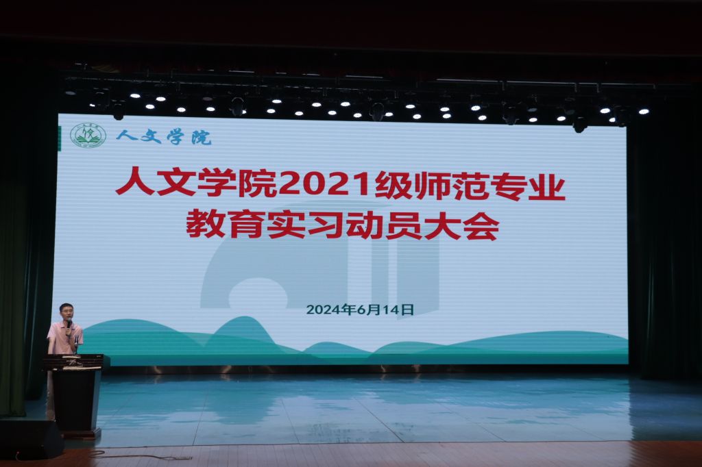 为切实提高学生的专业能力和师范素养,保障2024年秋季学期师范生实习工作顺利展开,人文学院于6月14日下午在弘善讲堂召开2021级师范专业教育实习动员大会。人文学院院长莫其逊、党总支书记庞一飞、副院长陈锴、党总支副书记韦微出席会议并讲话。实习指导教师、辅导员及2021级汉语言文学和英语专业学生参加会议。会议由副院长张超锋主持。