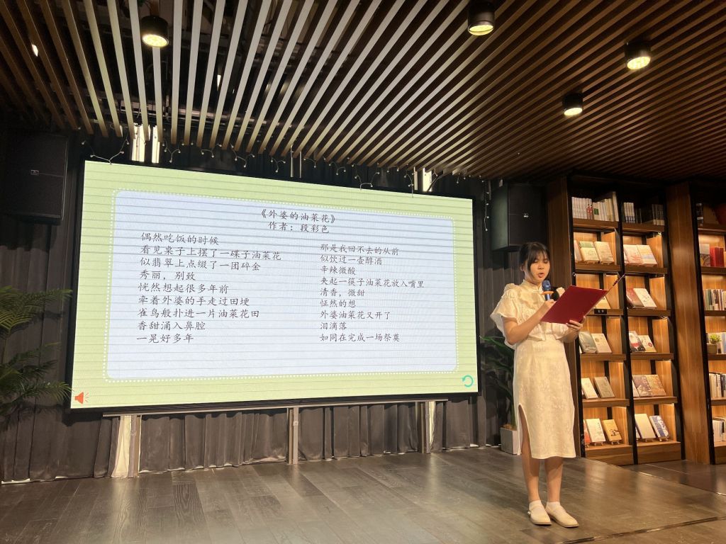 除了诗歌朗诵,活动还穿插了精彩的文艺表演,包括独唱《你曾是少年》和舞蹈《儿时、蝴蝶泉边串舞》,让现场观众在诗歌的海洋中也能感受到音乐与舞蹈的魅力。此外,活动特别设置了“和诗以歌”环节,将古诗词与现代音乐结合,朗诵者带来的《但愿人长久》等作品,让古典与现代交融,展现出诗歌的无限可能性。