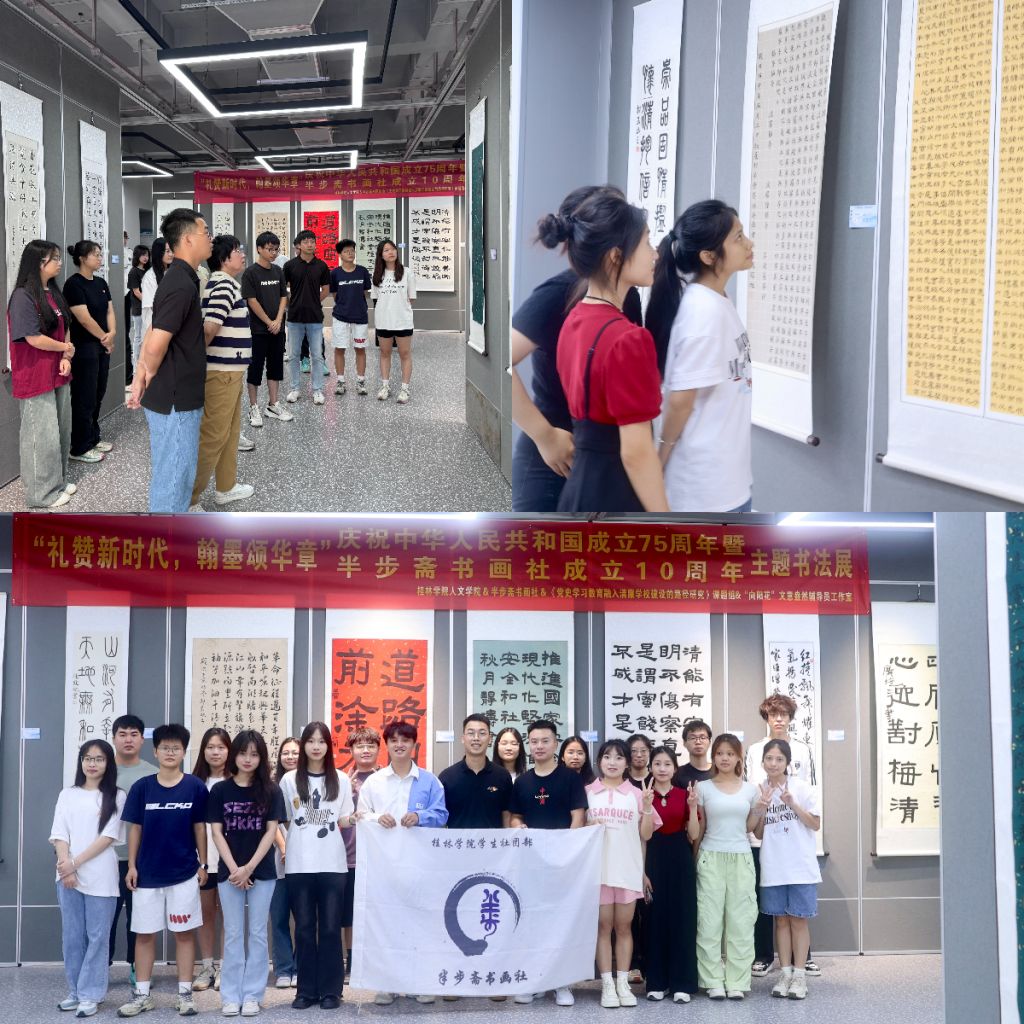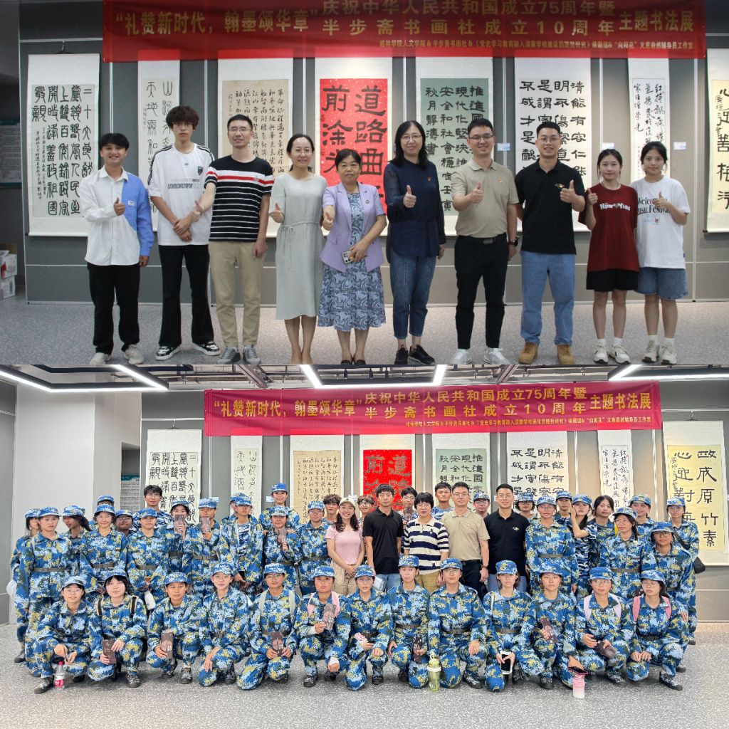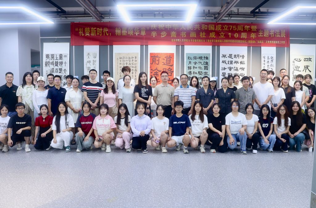 师生驻足欣赏书法作品、半步斋书画社成员合影