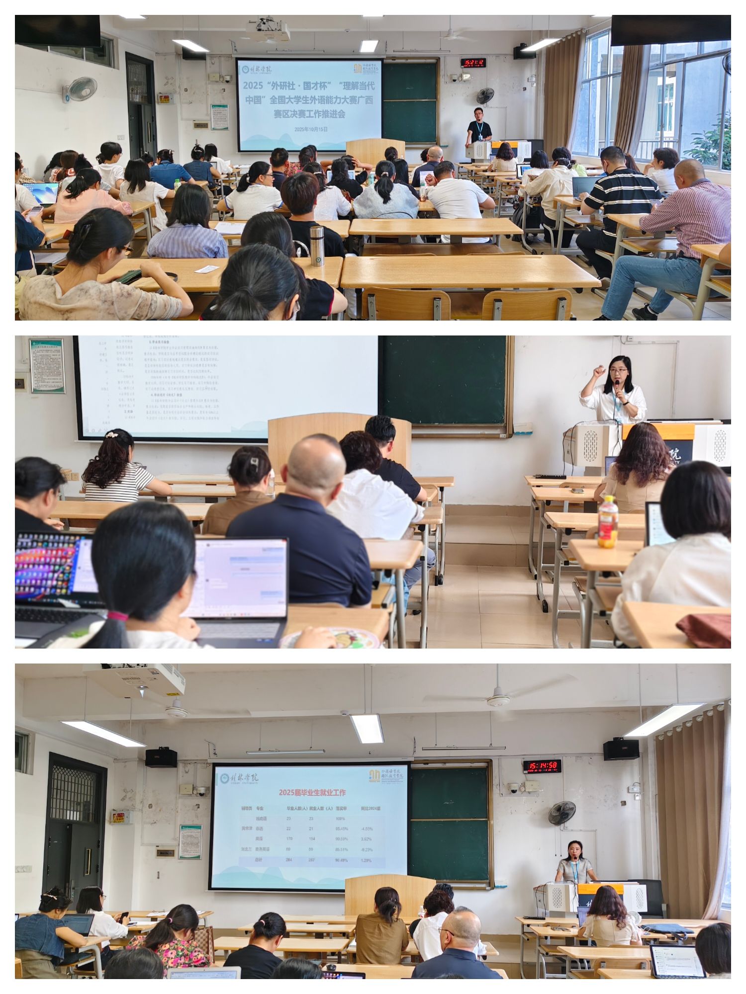 10月15日下午,外国语学院在至善楼1208教室召开全体教职工大会。会议由学院党总支书记主持,领导班子成员及全体教职工参会,核心任务是拆解2025“外研社・国才杯”“理解当代中国”全国大学生外语能力大赛广西赛区决赛筹备工作,同时统筹部署近期教学、就业、党建等重点任务。