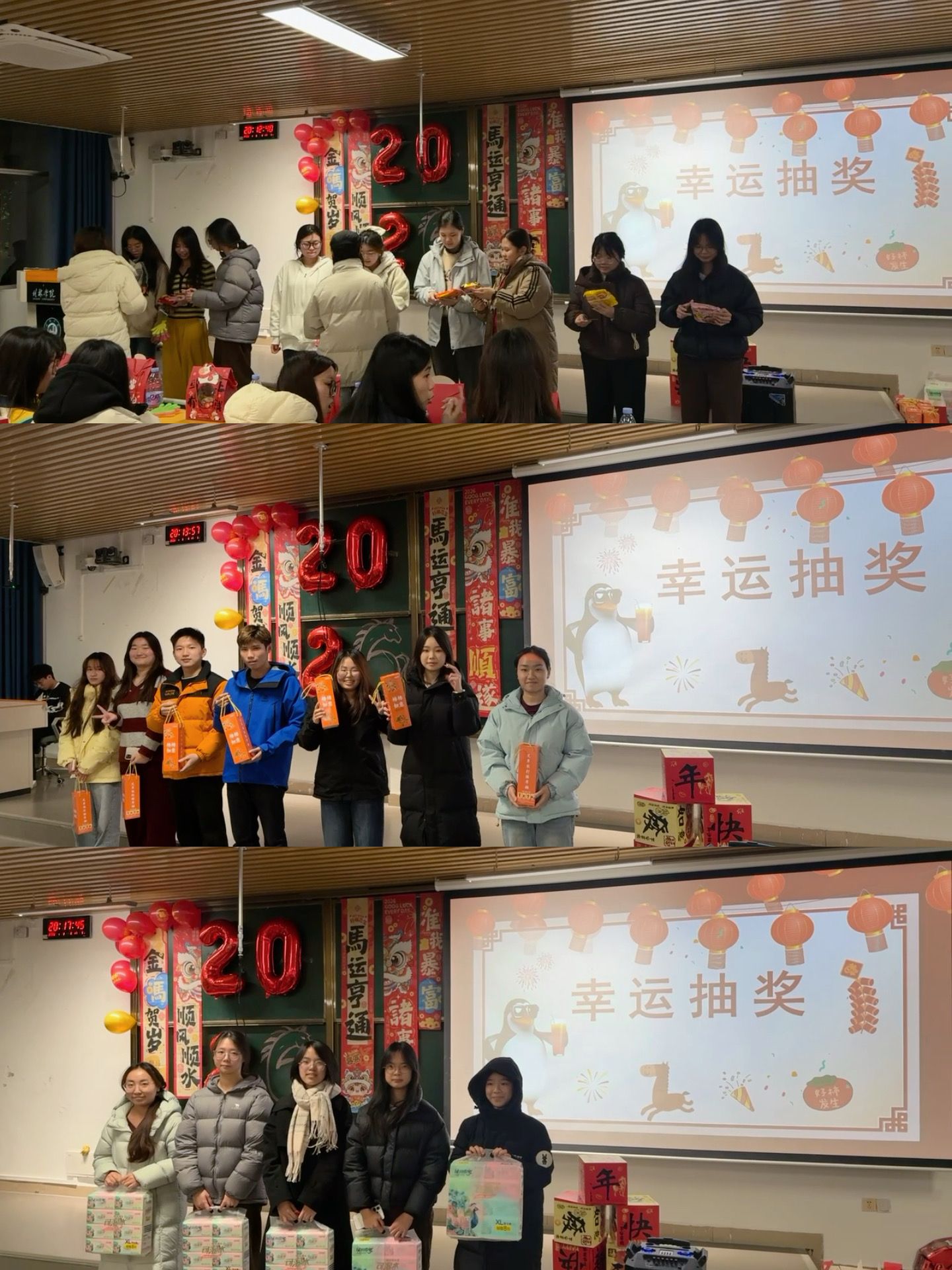 总结大会落幕,元旦联欢精彩接续。越南语专业蒋嘉庆同学率先献唱《my back》,动感旋律收获阵阵掌声;英语1班张春燕同学的魔术表演手法精妙,引发全场惊呼;商务英语1班陆旭同学的钢琴独奏《Merry Christmas, Mr. Lawrence》悠扬婉转,营造出温馨氛围;英语3班魏启同学的脱口秀《神马都好》诙谐幽默,将现场气氛推向小高潮。活动尾声,各班班长携手合唱《晴天》,熟悉的旋律掀起全场大合唱,温情满溢。互动环节的幸运抽奖,更让现场欢声笑语不断。