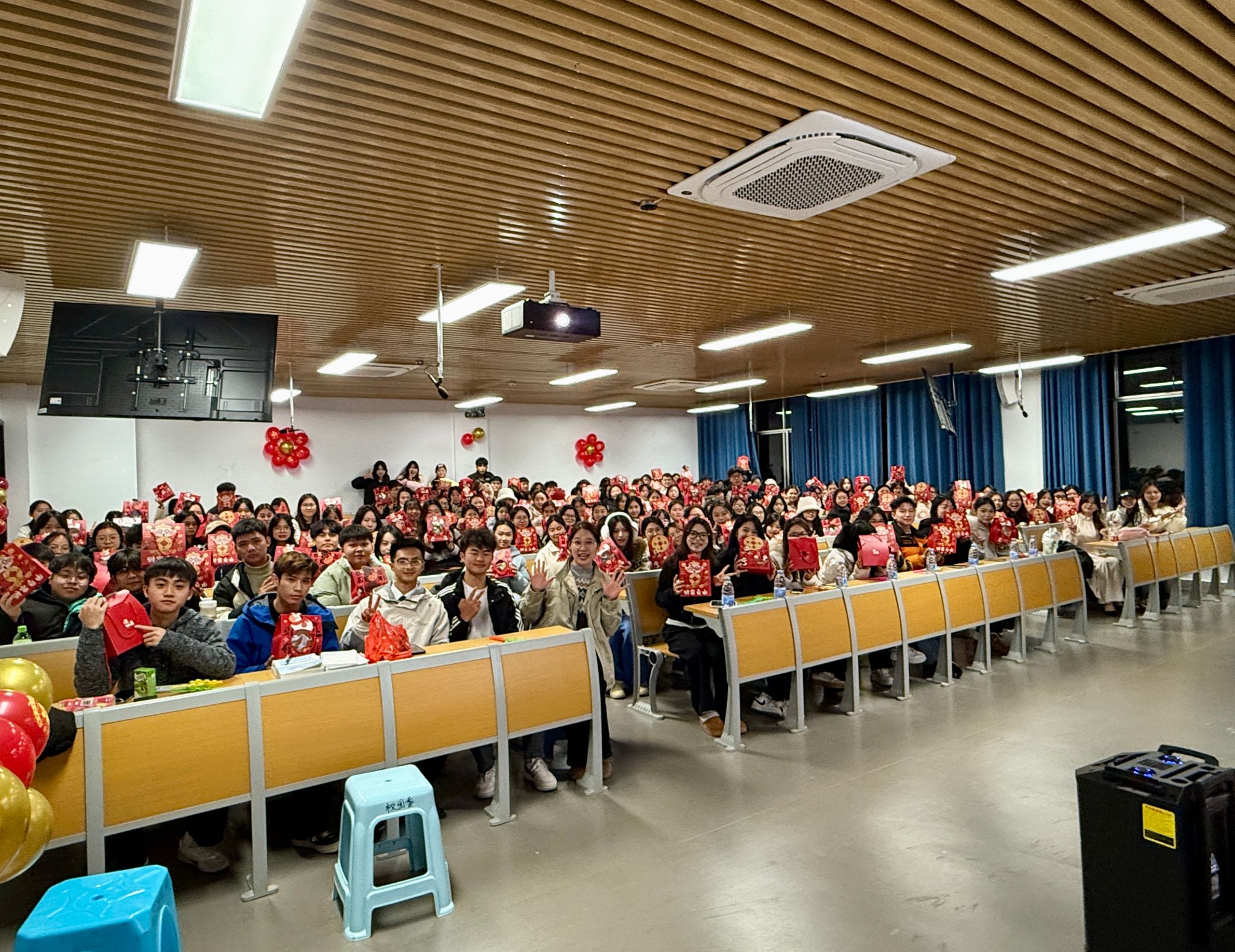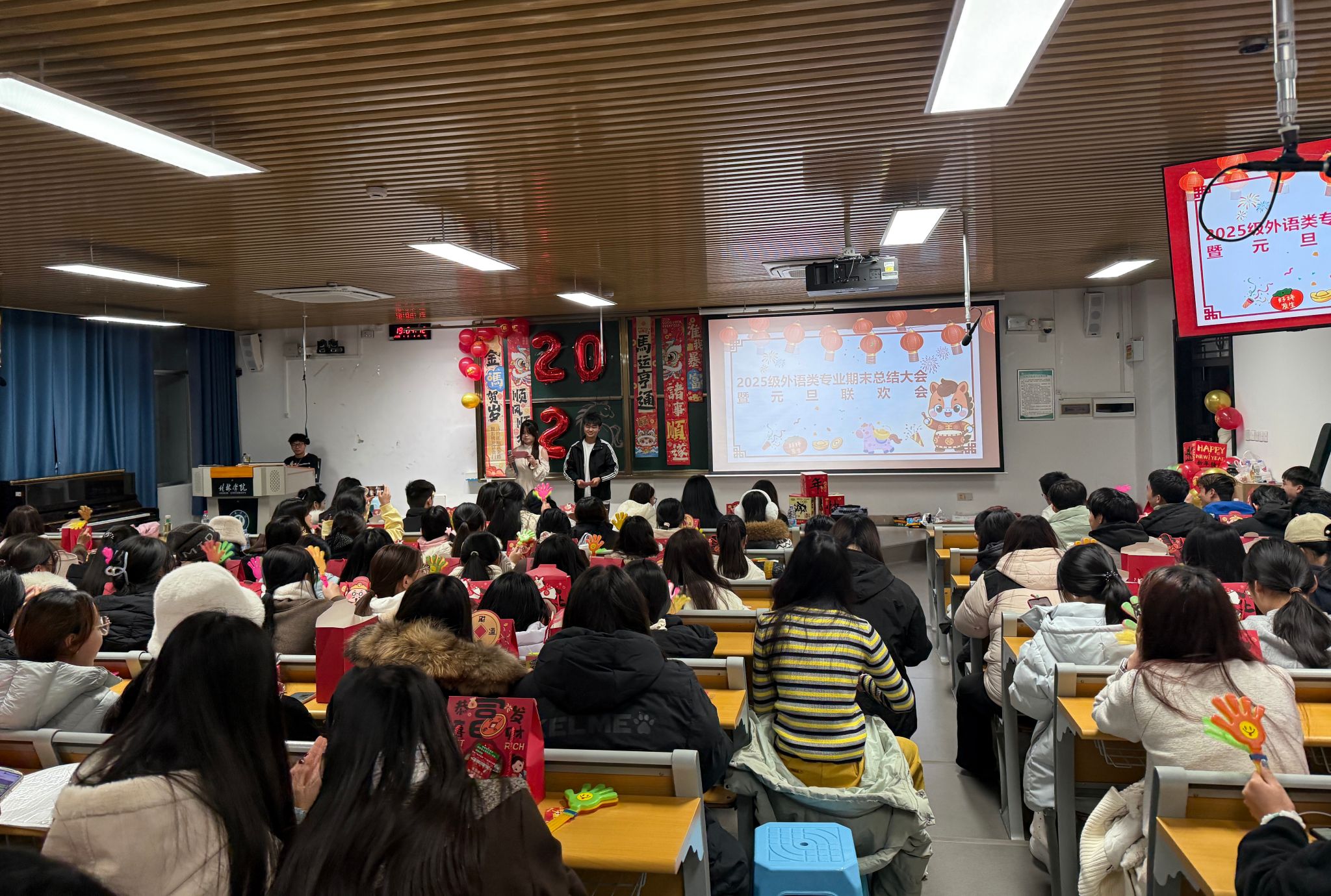 为全面总结本学期年级工作,凝聚学子向心力,共迎新年到来,1月3日晚,外国语学院2025级全体新生期末总结大会暨元旦联欢活动顺利举行。