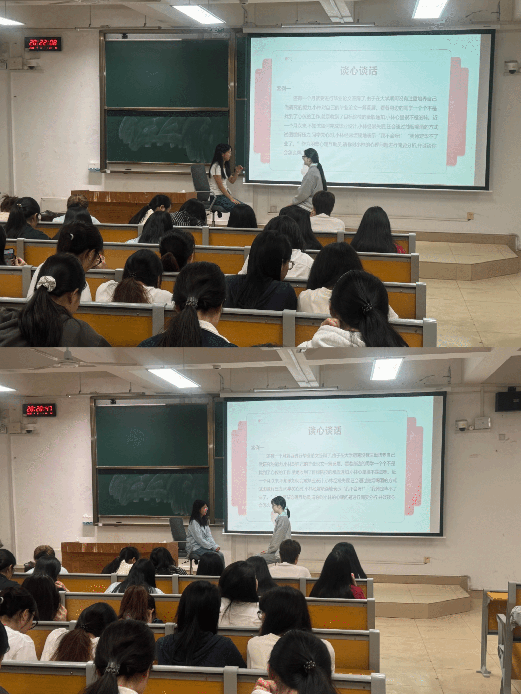知识测试环节的试题依托历年区赛题库命制,覆盖心理健康基础知识、常见心理问题应对等核心内容,选手们沉着思考、认真作答,充分展现了扎实的心理知识积累。辅导模拟环节中,选手们沉浸式开展谈心谈话,尽显朋辈辅导的专业素养。