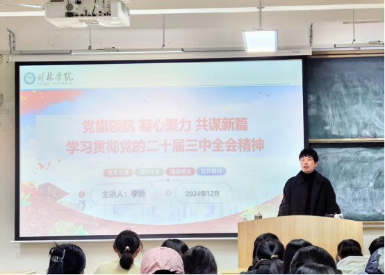 活动现场,李杨深入剖析全会要点,着重解读进一步全面深化改革的核心遵循,强调坚持党的全面领导是根本原则,犹如指南针确保改革不偏航向;点明以人民为中心的价值取向,让改革红利惠及师生与社会大众。针对总目标及六个原则,结合生动实例阐述内涵,从宏观战略到微观实践,抽丝剥茧般讲解15个方面的系统部署,点明其与学院发展、师生成长、青年奋斗的紧密关联,如在学科建设对接社会需求、校园文化契合时代精神等层面的指引作用。同时,聚焦当下重大任务,号召将个人发展融入国家改革大势,以实际行动践行全会精神。