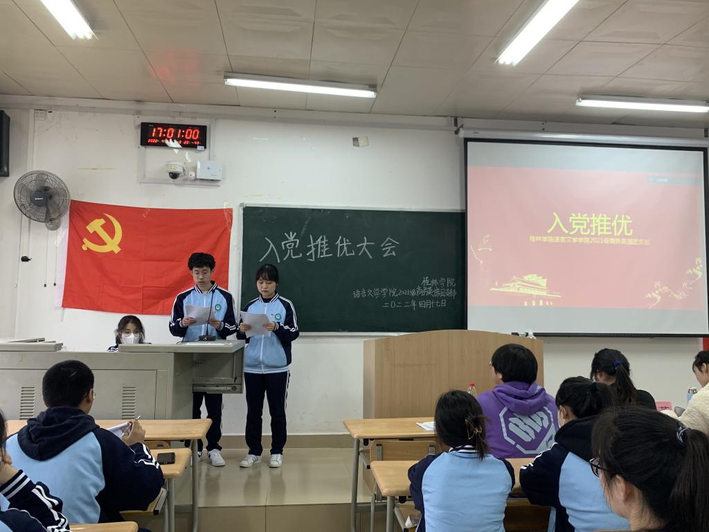 “推优”工作是党赋予共青团组织的一项光荣任务。为切实落实学校党建工作要求,推荐优秀团员向党组织靠拢,充实壮大党的后备力量,4月17日下午,语言文学学院2021级商务英语团支部在至善楼1408教室开展入党推优大会。会议由2021级商务英语团支部周浈尧、钱思宇主持,全体同学参加会议。