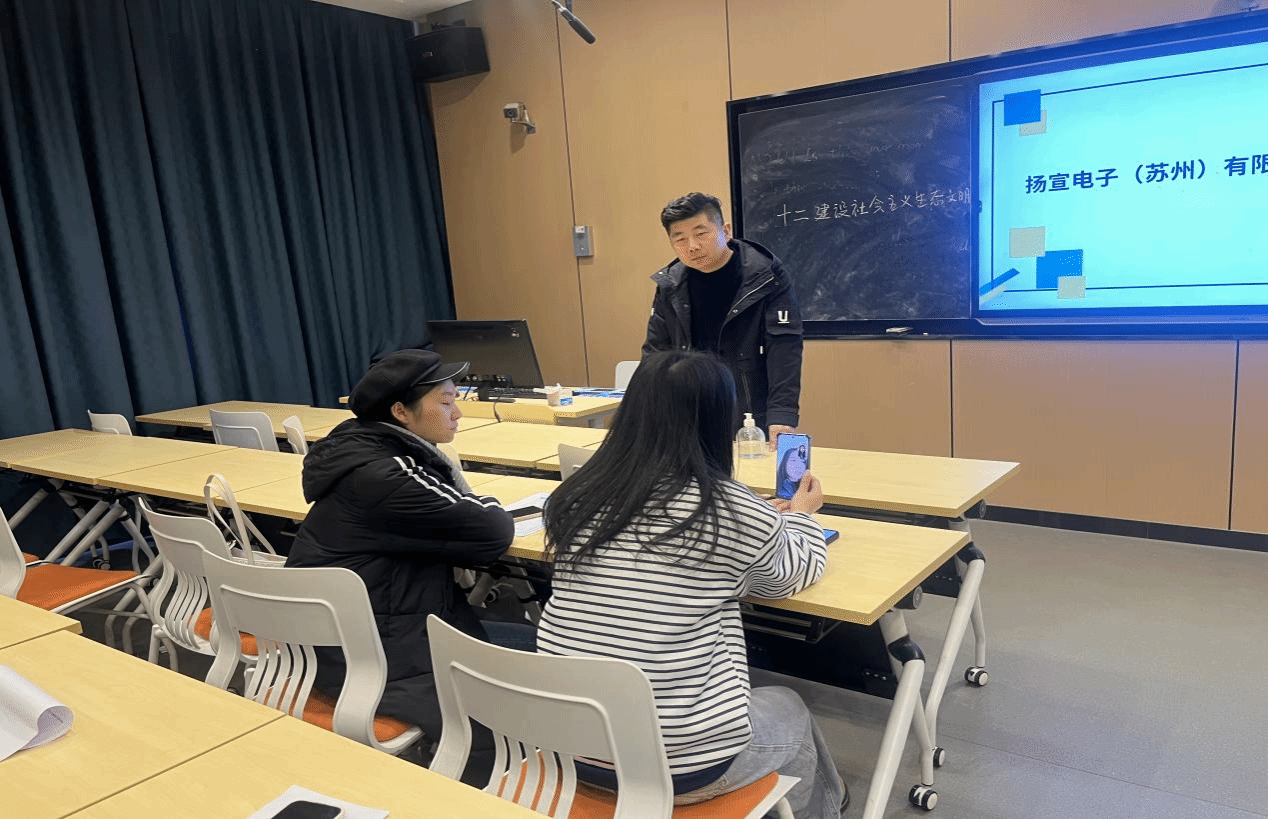 宣讲环节中,蒋传利主任围绕建滔集团的发展历程、行业地位及扬宣电子(苏州)有限公司的运营现状展开详细介绍,从业务布局到核心优势,全方位展现了企业的综合实力。他重点解读了本次招聘的岗位职责、任职要求,明确了极具竞争力的薪资福利体系及清晰的职业晋升路径,为学子们勾勒出可触可及的职业发展蓝图。为打破空间壁垒,让同学们直观感受海外工作环境与跨文化职场氛围,宣讲会创新设置实时视频连线环节,蒋主任现场接通公司越南籍在职员工,通过面对面交流解答同学们关于工作场景、生活适配、文化融入等核心疑问,真实的体验反馈与生动分享将现场气氛推向高潮。