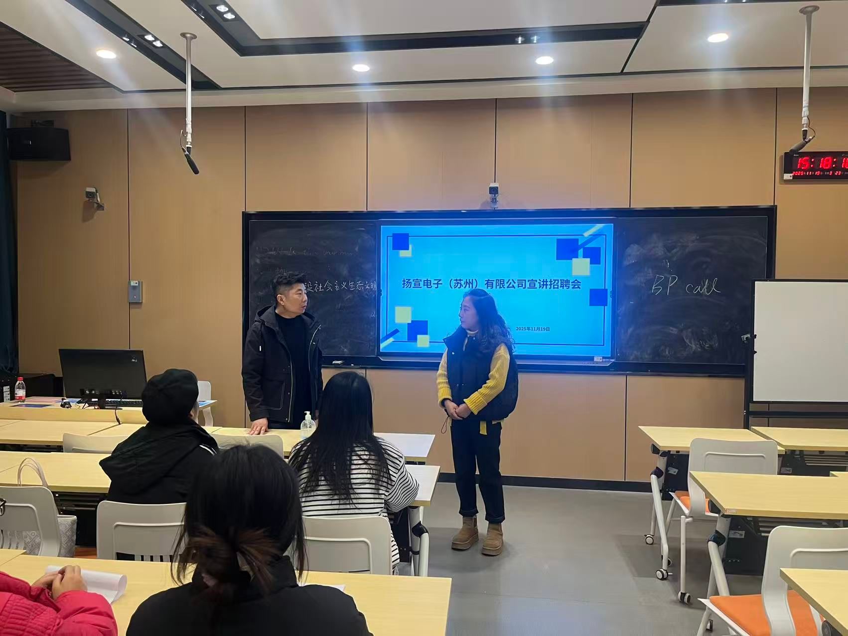 11月19日,外国语学院联合建滔集团扬宣电子(苏州)有限公司成功举办越南语专业专场招聘宣讲会。建滔集团人事部主任蒋传利莅临现场主讲,学院党总支副书记、越南语教研室主任与全体越南语专业学子共同参与,这场精准对接的招聘活动为校企合作搭建起就业桥梁,为学子职业发展注入强劲动力。