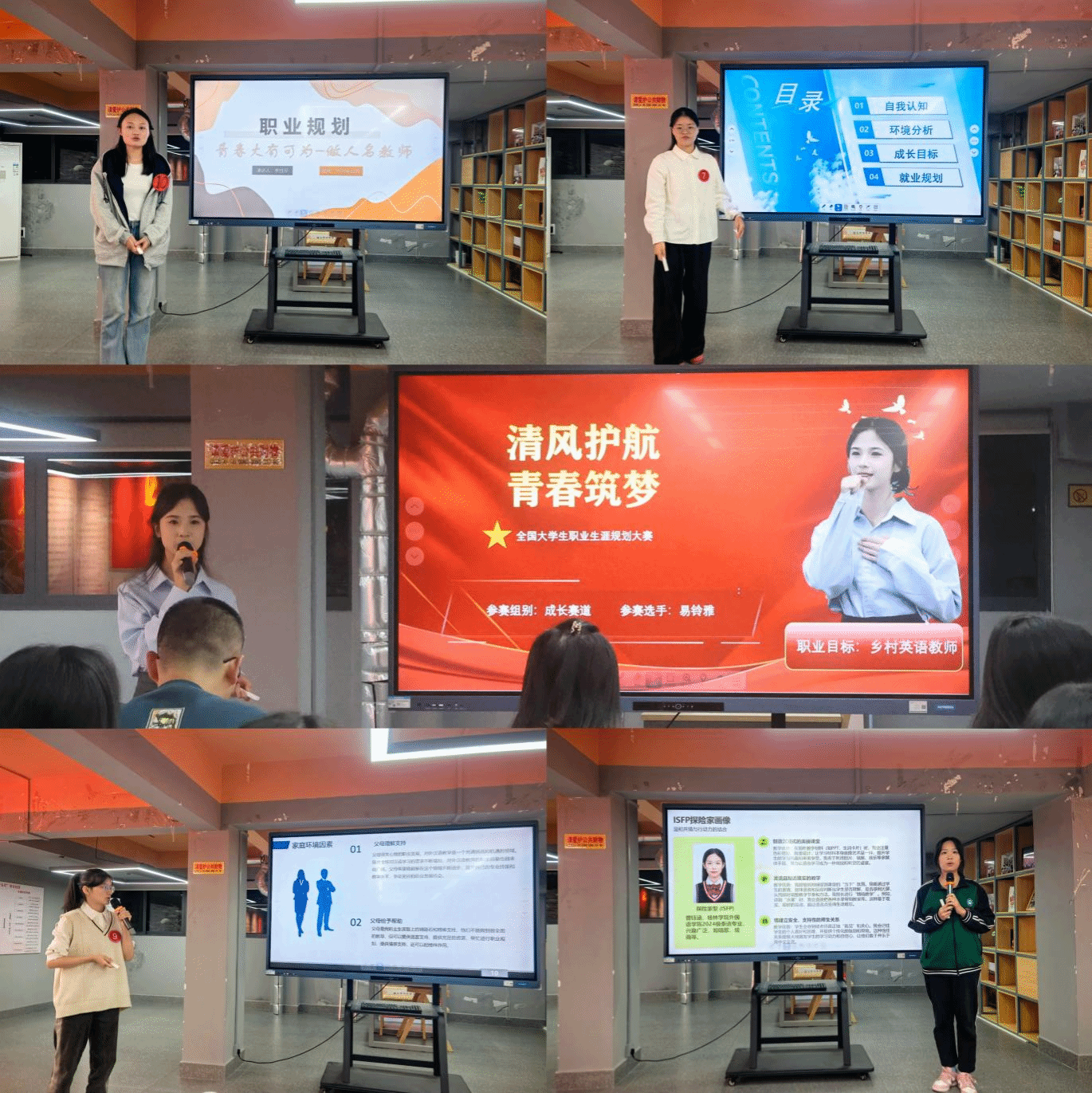 决赛现场气氛热烈,选手们精神饱满、逻辑清晰,凭借精心制作的展示课件和富有感染力的演讲,全面阐述职业规划蓝图。有的选手以“乡村英语教师”为目标,结合ISFP人格特质与乡村教育发展需求,勾勒扎根基层、赋能乡村学子的成长路径;有的选手聚焦跨境语言服务领域,立足行业趋势制定阶梯式发展计划,展现了新时代大学生的前瞻视野与实干精神。评委团从内容完整性、规划可行性、方案创新性及表达感染力等维度综合评分,现场给出针对性指导建议,助力选手完善规划、明晰方向。