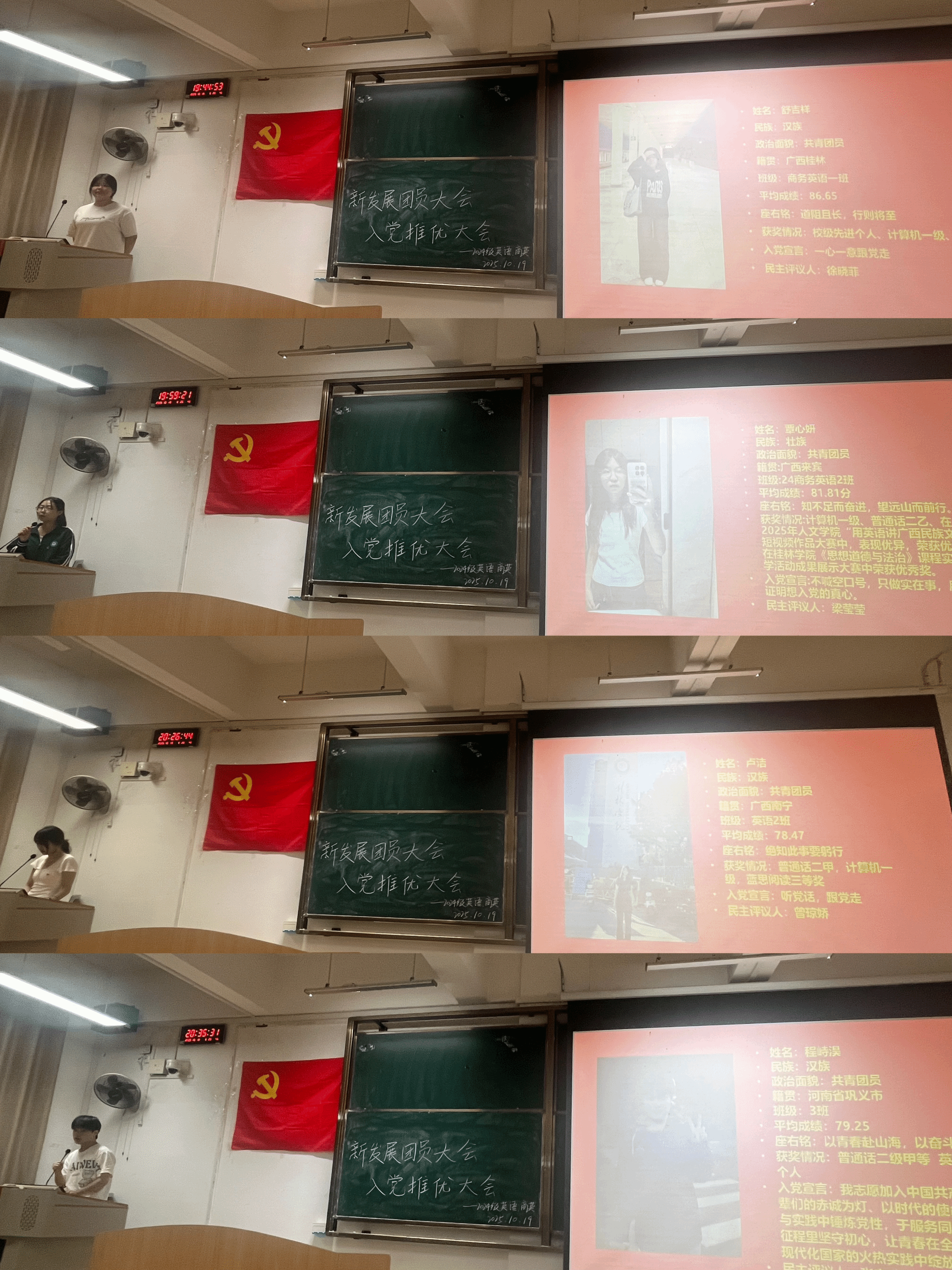 在候选人陈述环节,各位推优候选人精神饱满、言辞恳切,结合自身成长经历,从思想认识、学习科研、志愿服务、学生工作等方面进行全面汇报。他们真挚分享了自己入党动机的形成与升华过程,畅谈了学习党的创新理论的感悟收获,实事求是地剖析了自身优势与不足,并坚定表达了向党组织靠拢、以党员标准严格要求自己、为党和人民事业贡献青春力量的决心。候选人的赤诚之心与责任担当,深深触动了在场的每一位团员,现场不时响起阵阵掌声。