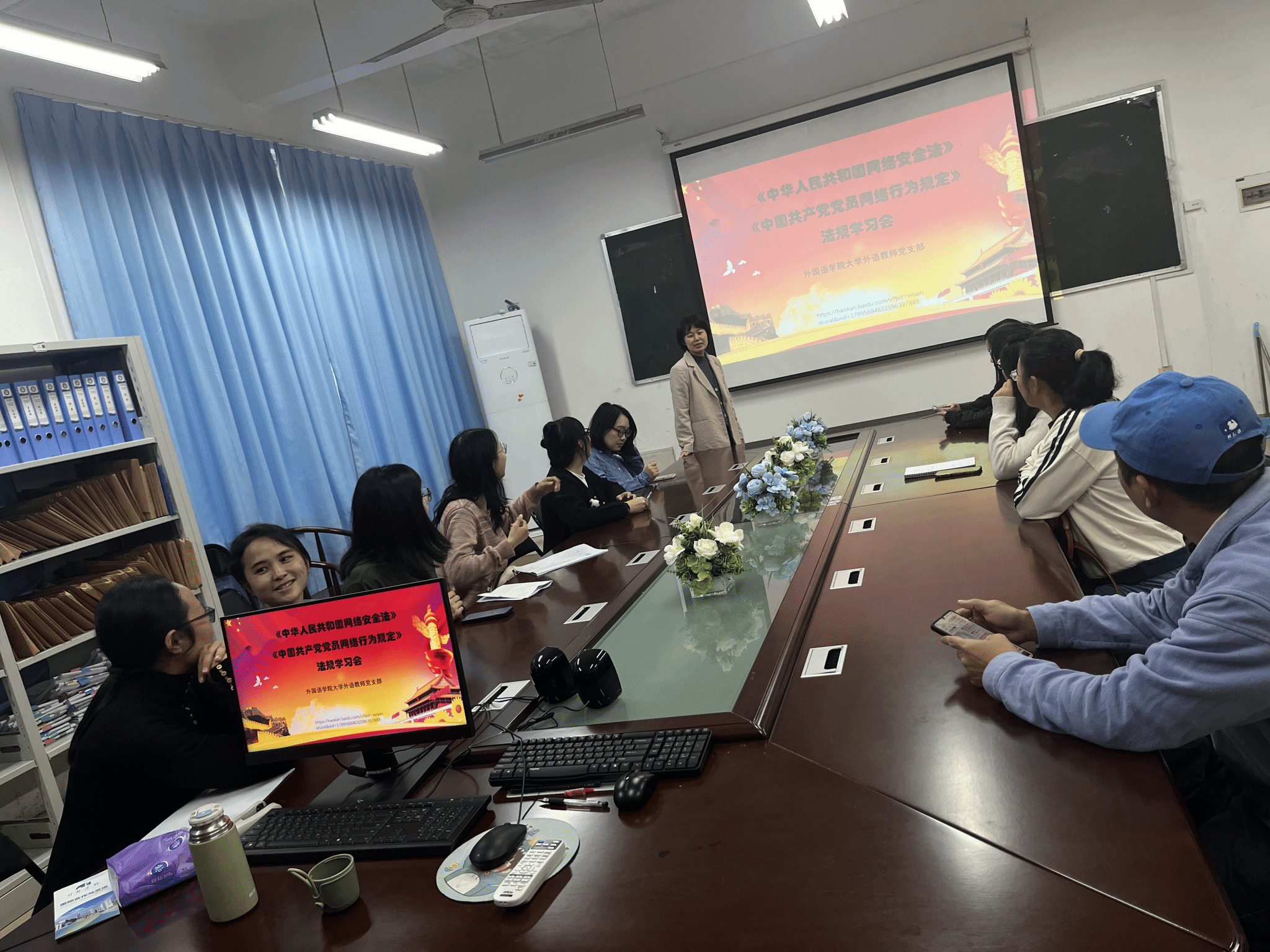 为深入学习贯彻习近平总书记关于教育的重要论述,强化党员网络安全意识与行为规范,11月13日上午,大学外语教师党支部在2108会议室举行“书记上党课”专题学习活动。活动由支部书记蒋瑛主持,全体党员教师积极参与,现场交流热烈,学习氛围浓厚。