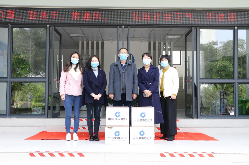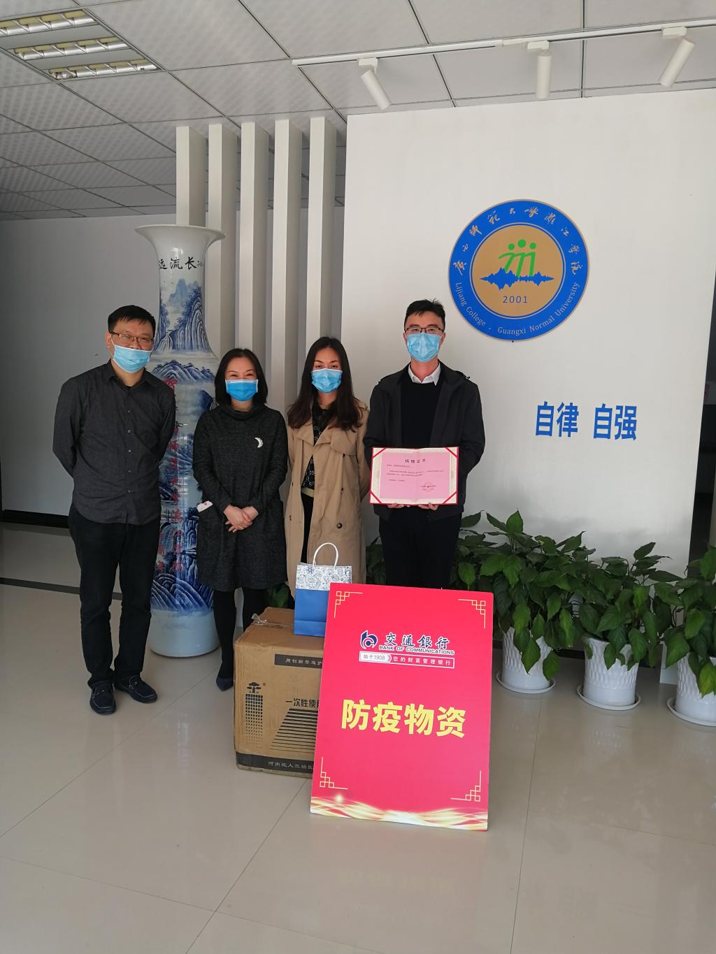 图:4月8日,中国建设银行桂林市高新技术开发区支行向学校捐赠防疫口罩2000个。校长杨树喆,总会计师祝芸芸出席捐赠仪式