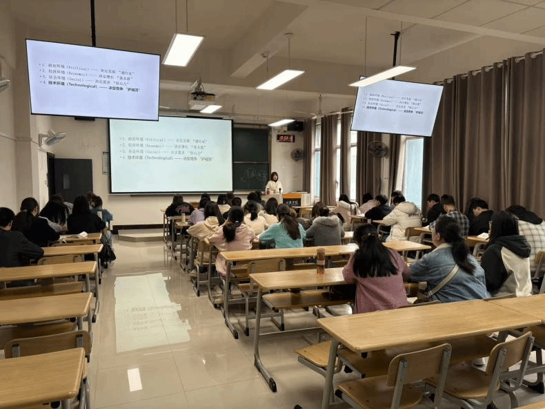 《公司战略与风险管理》课程授课教师范冬英老师紧扣“宏观环境—产业环境—竞争环境”三层分析框架,结合PEST分析模型、波特五力模型等专业工具,通过直观的课件演示、清晰的逻辑梳理与生动的案例拆解,将抽象的战略管理理论转化为具象可感的知识内容。课堂上,教师精准把握教学重难点,引导学生层层剖析企业外部环境的影响因素,学生积极参与思考互动,课堂节奏紧凑、逻辑清晰,课堂气氛较活跃。