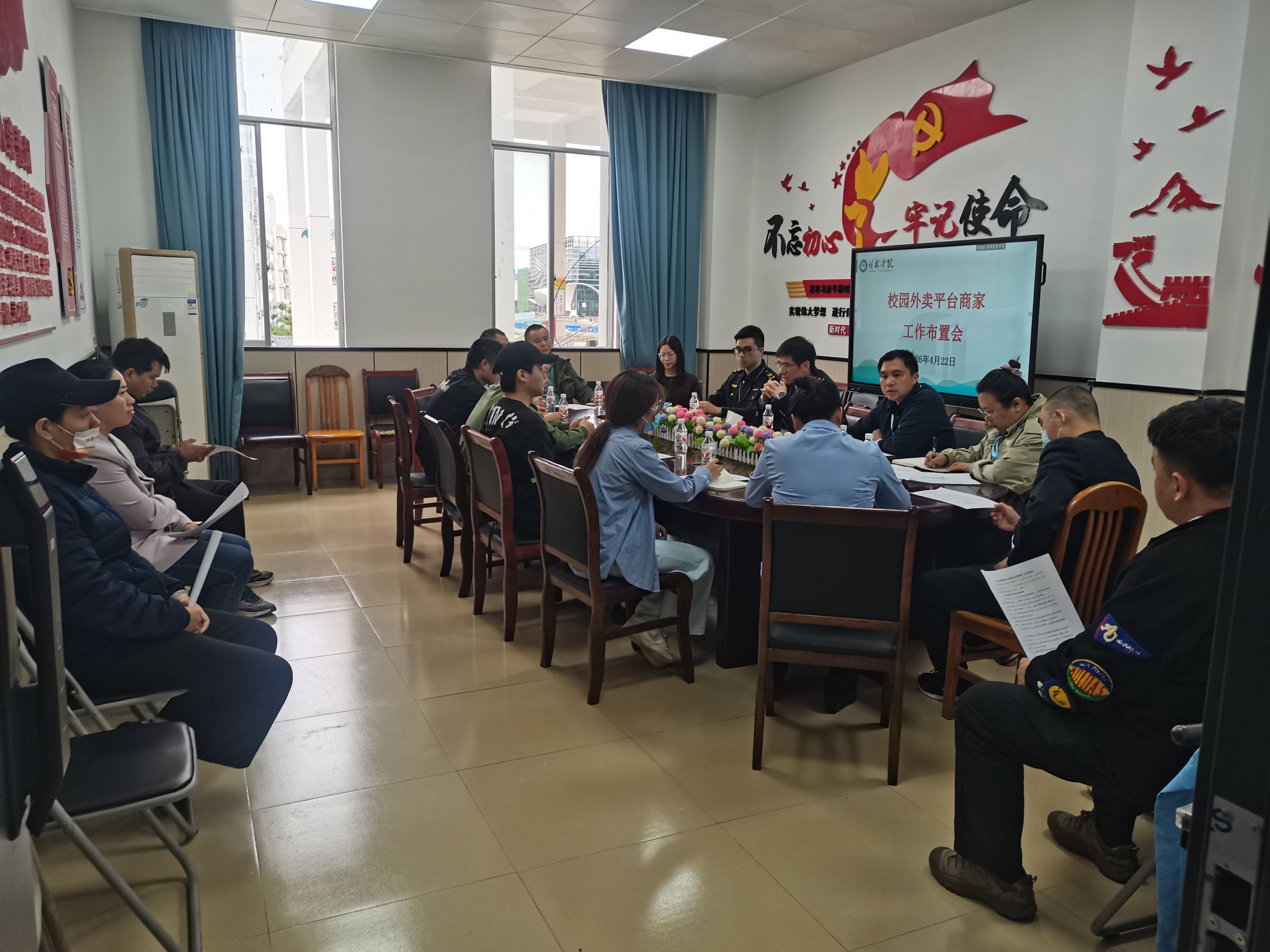 为加强校园外卖食品安全,规范网络餐饮经营,保障师生合法权益,2026年4月22日下午,雁山区市场监督管理局到校开展外卖平台商家专项检查指导工作,学校后勤基建处相关负责人、外卖平台校园运营商、学校食堂承包商及校内入网餐饮商户共同参加迎检和座谈。