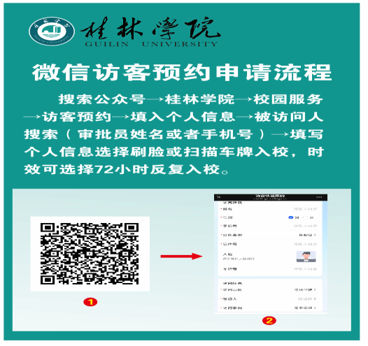 扫描二维码或通过桂林学院公众号→桂林学院→校园服务→访客预约→填入个人信息→被访问人搜索(审批员姓名或手机号)→填写个人信息选择刷脸或扫描车牌入校,时效可选择72小时反复入校。