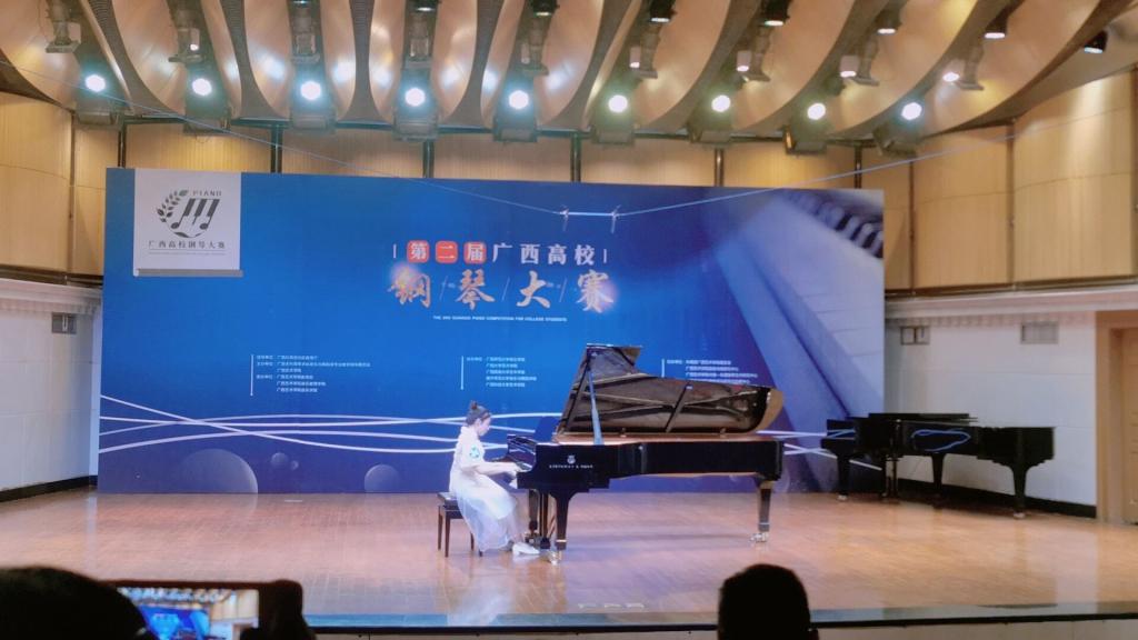 本赛事是广西区唯一一个由教育厅主办的专业钢琴比赛,代表了广西高校钢琴专业的最高水平。比赛历经数天角逐,我校教育与音乐学院师生团队发扬团结协作、积极奋进的精神,最终7名师生自数千名参赛者中脱颖而出,获师范组一等奖2项、三等奖1项,非专业组三等奖2项,双钢与四手联弹组三等奖1项,取得了该项赛事我校首次参赛的开门红。