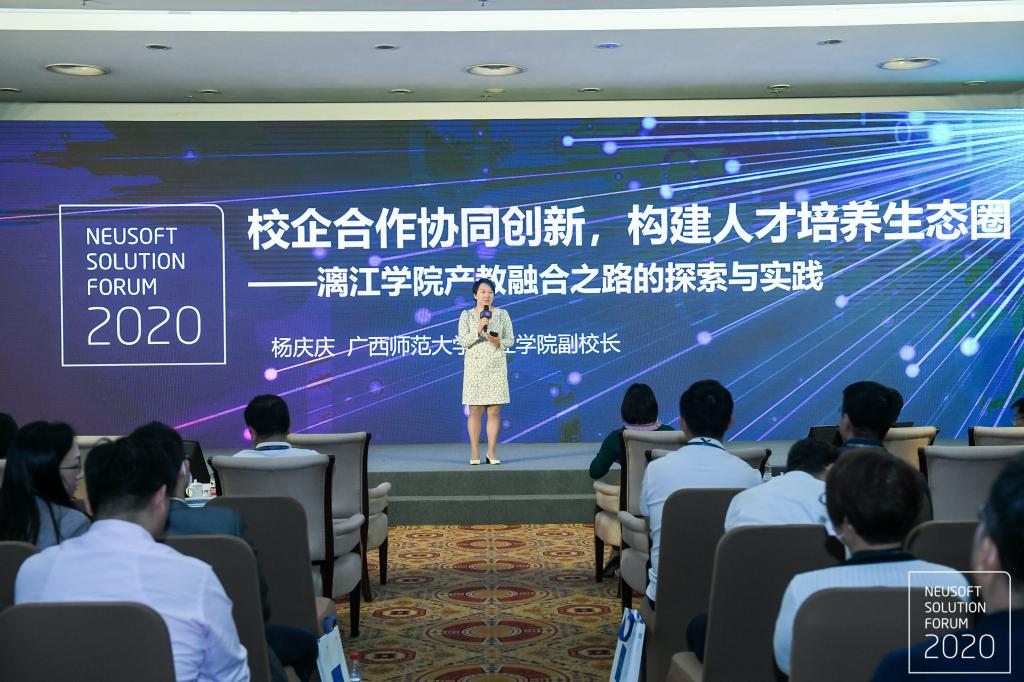 在平行论坛上,学校副校长杨庆庆作了题为《校企合作协同创新,构建人才培养生态圈》的主题演讲,杨庆庆介绍了我校基本情况、产业与教育结合的情况及我校产业学院的探索和实践,表示我校希望通过产教融合协同发展、与企业共同构建人才培养的生态圈,希望我校与东软集团的合作能取得多赢的成果和示范作用,使产教融合成为漓江学院发展的动力引擎。