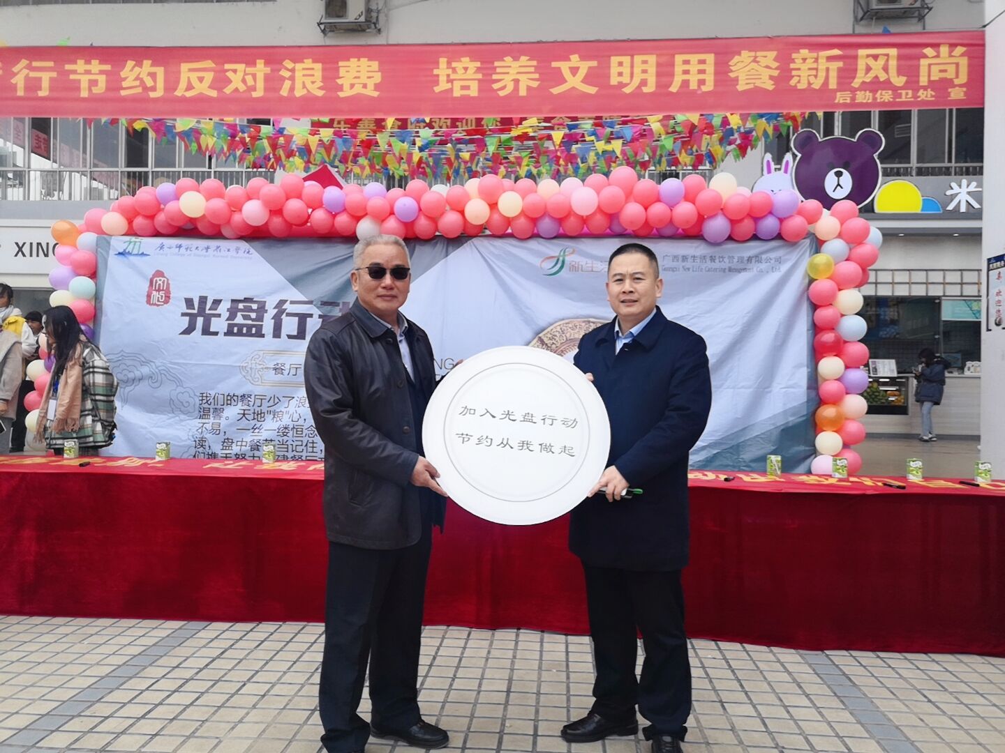 为深入贯彻习近平总书记关于坚决制止餐饮浪费行为重要指示精神,培养厉行节约、反对浪费新风尚,11月27日中午,学校后勤保卫处在乐善广场开展“光盘行动,从我做起”主题宣传活动,学校副校长刘文革、后勤保卫处及新生活餐饮公司相关负责人出席活动。