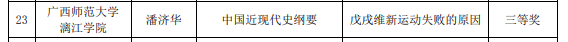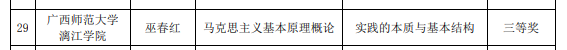 为了充分彰显党的十八大以来我区高校思政课建设取得的成就,深入推动习近平新时代中国特色社会主义思想进教材、进课堂、进头脑,推动思想政治理论课提质增效,区党委教育工委、自治区教育厅2020年7月在全区高校思政课教师中开展学习习近平新时代中国特色社会主义思想示范课堂征集活动。我校马克思主义学院积极组织各教研室参加2020年全区高校学习习近平新时代中国特色社会主义思想示范课堂,共推荐九个“示范课堂”参赛。张翠方老师的《铭记湘江战役 弘扬长征精神 走好新时代的长征路》荣获 “中国近现代史纲要”课程一等奖;潘济华老师的《戊戌维新运动失败的原因》荣获“中国近现代史纲要” 课程三等奖;巫春红老师的《实践的本质与基本结构》荣获“马克思主义基本原理概论”课程三等奖。