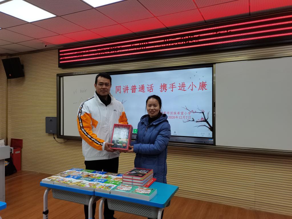 “同讲普通话,携手进小康”为2020年全国第23个推普周的活动主题。为切实落实该主题,加强通用语言文字教育,大力提升普通话普及率,12月7日,我校语言文字工作委员会前往桂林市草坪回族希望小学开展推普活动。该小学作为广西唯一回族乡小学,具有鲜明的特色。校语委副主任、教学与科研管理处处长杨杰夫带队,一行七人作为语委代表,为草坪回族希望小学开展推普活动并赠书。