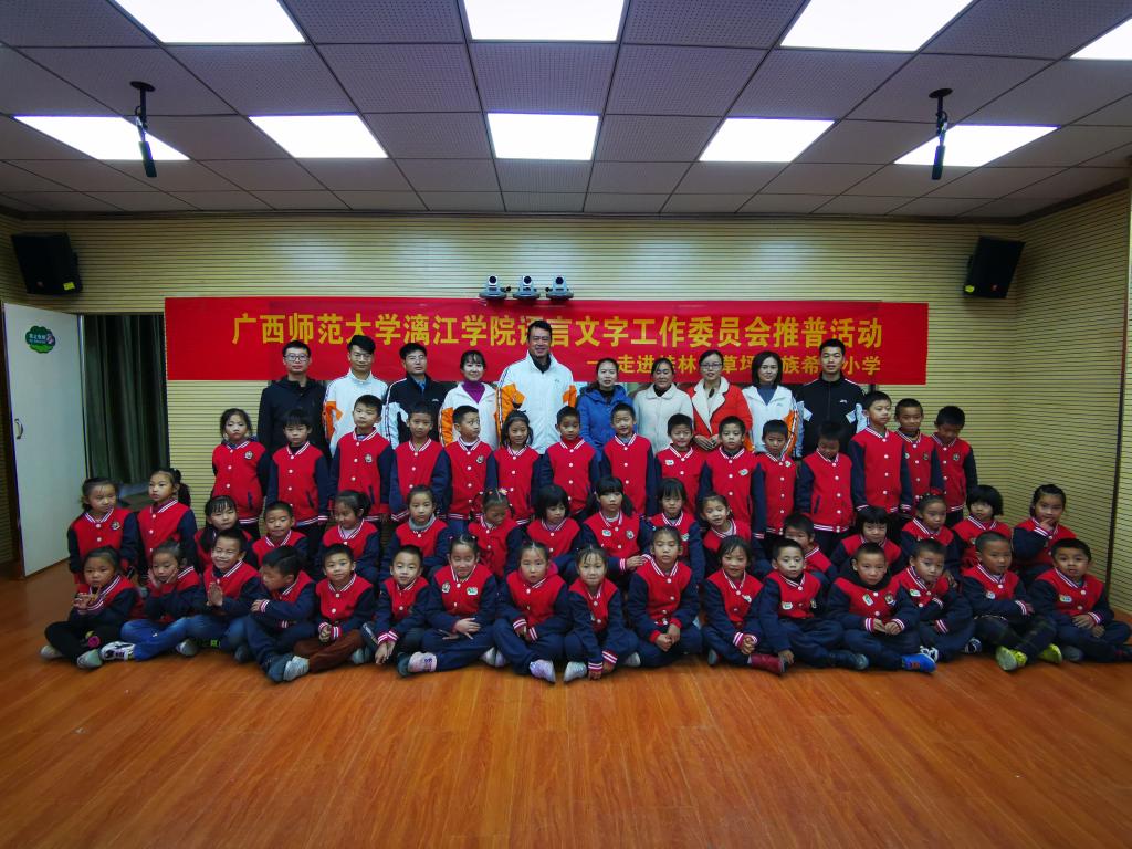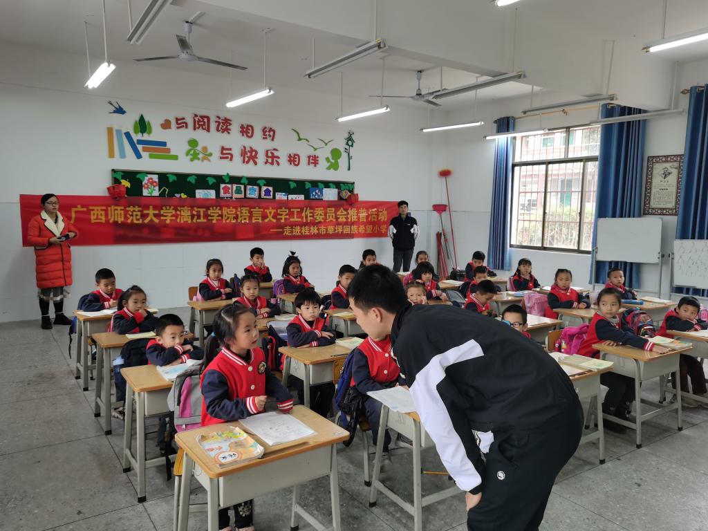 推普主要包括两大内容:推广普通话,书写规范字。本次活动参与对象为草坪回族希望小学一年级两个班级的学生。校语委依据推普主题设立两个子活动,一是“传文化经典,诵千古之诗”诵读活动,选取两篇一年级课文及古诗为诵读对象,让小学生掌握朗读小技巧,同时就轻声、儿化等知识点进行专门教学;二是“泼墨造物,笔下生花”书写活动,以一年级笔画、笔顺等知识点为主要教学内容,同时教授学生正确的书写姿势。活动最后,杨杰夫处长代表校语委向桂林市草坪回族希望小学赠送文学、文化类书籍68册。