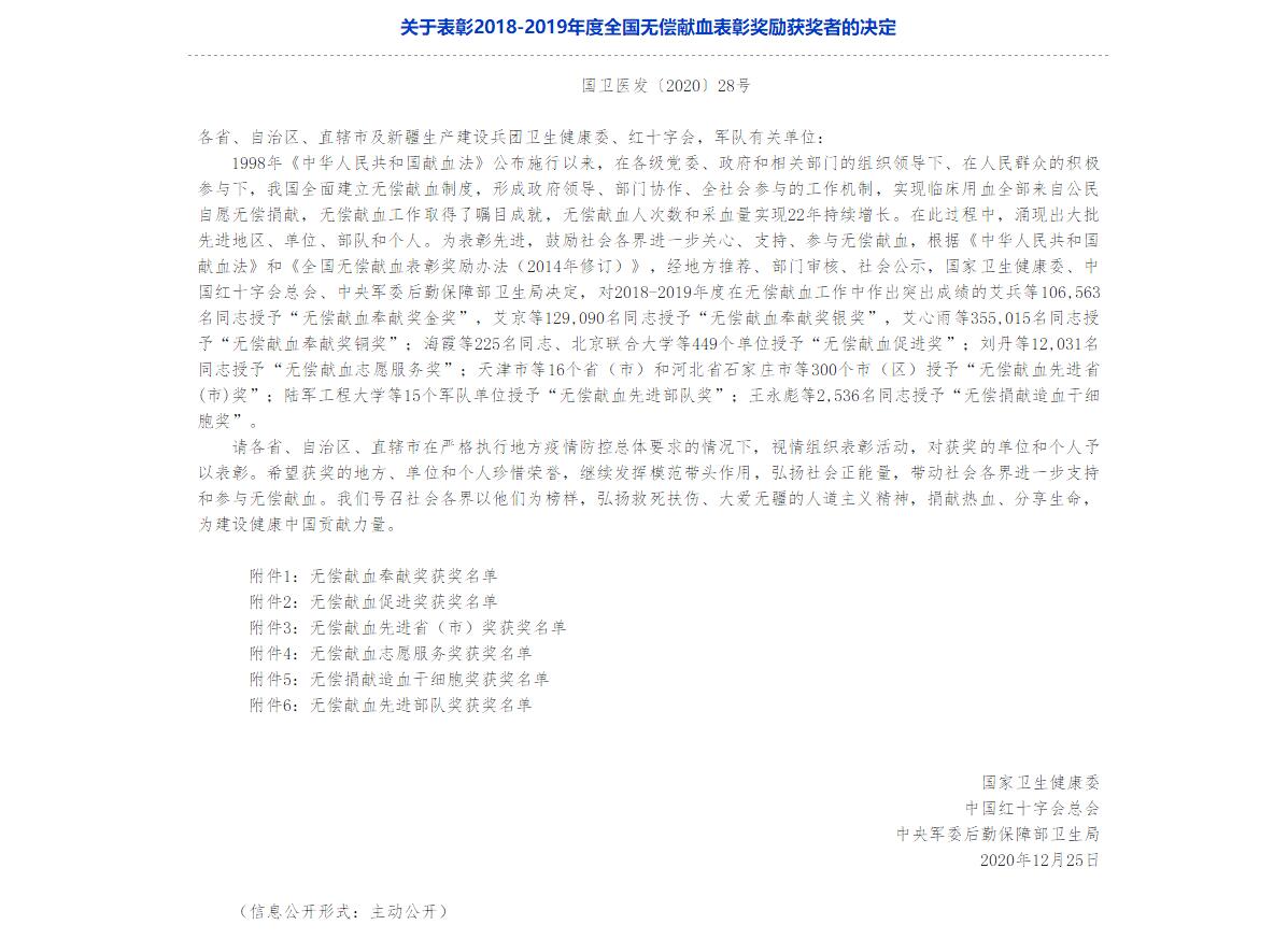 近日,国家卫生健康委员会、中国红十字总会、中央军委后勤保障部卫生局发布了《关于表彰2018-2019年度全国无偿献血表彰奖励获奖者的决定》(国卫医发〔2020〕28号),我校荣获2018-2019年度全国“无偿献血促进奖”。