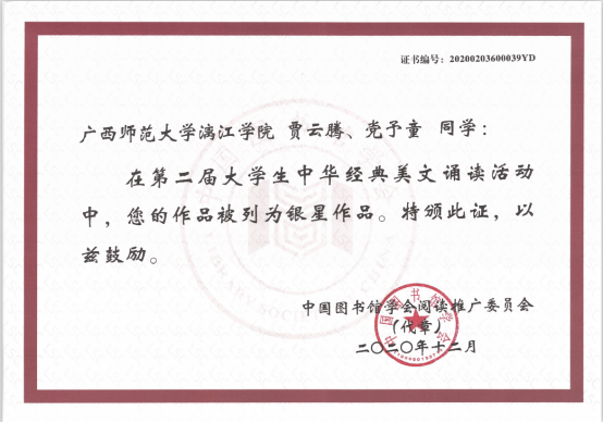 近日,中国图书馆学会阅读推广委员会主办的第二届全国大学生中华经典美文诵读活动结果公布,由我校图书馆组织选送的语言文学学院贾云腾、党予童的诵读作品《乌骓别霸王》获银星作品奖,语言文学学院周煜喆的诵读作品《将进酒》获铜星作品奖。