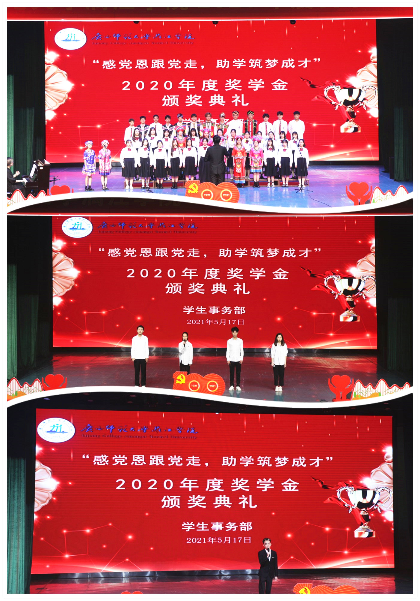 在颁奖典礼上,校大学生艺术团以合唱《唱支山歌给党听》、朗诵《赞美》、独唱《大写的国》的形式表达对党、对祖国、对学校的热爱与感恩之情,体现出“向学、向善、自律、自强”的校训精神,展现漓院学子自强不息、勇于奋斗的良好精神风貌!